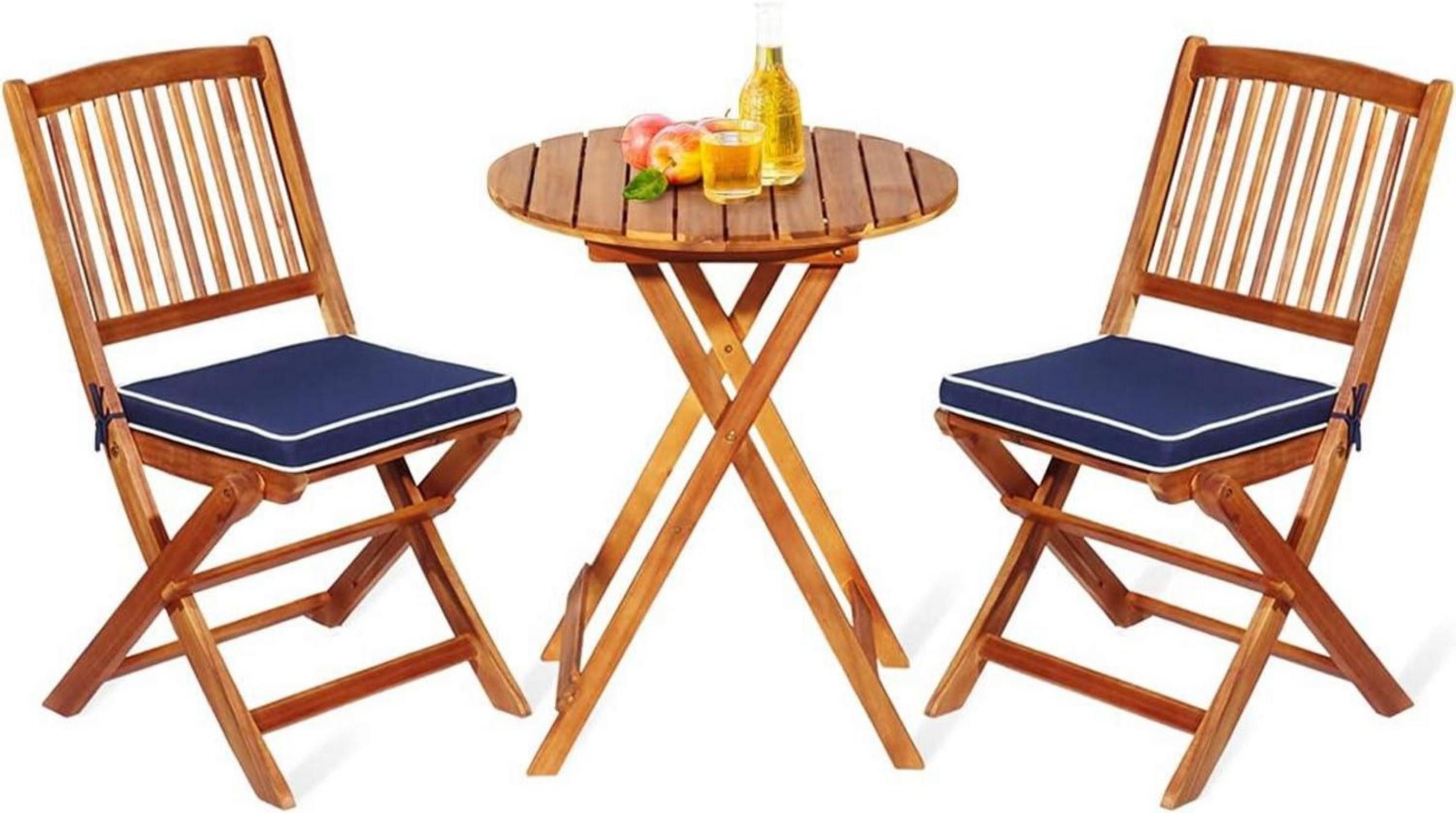 Das GOPLUS 3-teilige Gartenmöbel Set aus Akazienholz ist die perfekte Ergänzung für Ihren Außenbereich. Die Sitzgruppe besteht aus einem klappbaren Rundtisch und 2 Stühlen mit Kissen in einem ansprechenden Blauton.
