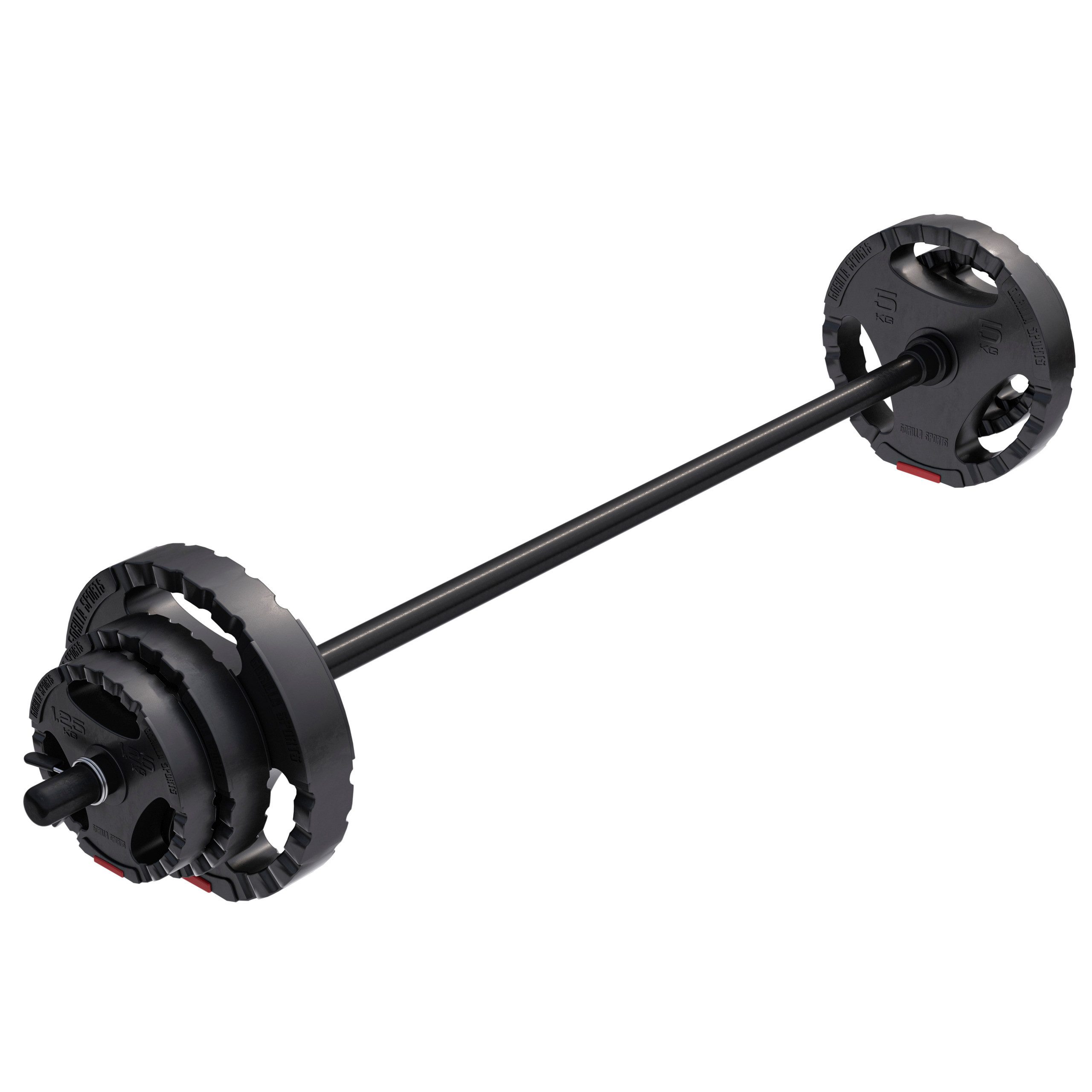 Für Dein professionelles Aerobic-Training: Das Langhantelset mit Kunststoff-Ummantelung und -Gripper ist das ideale Equipment für einen Fitness-Kurs wie Bodypump. Die Hantelscheiben aus Kunststoff mit den gerillten Griffen eignen sich ohne Hantelstange auch für den Einsatz beim Cross-Training.