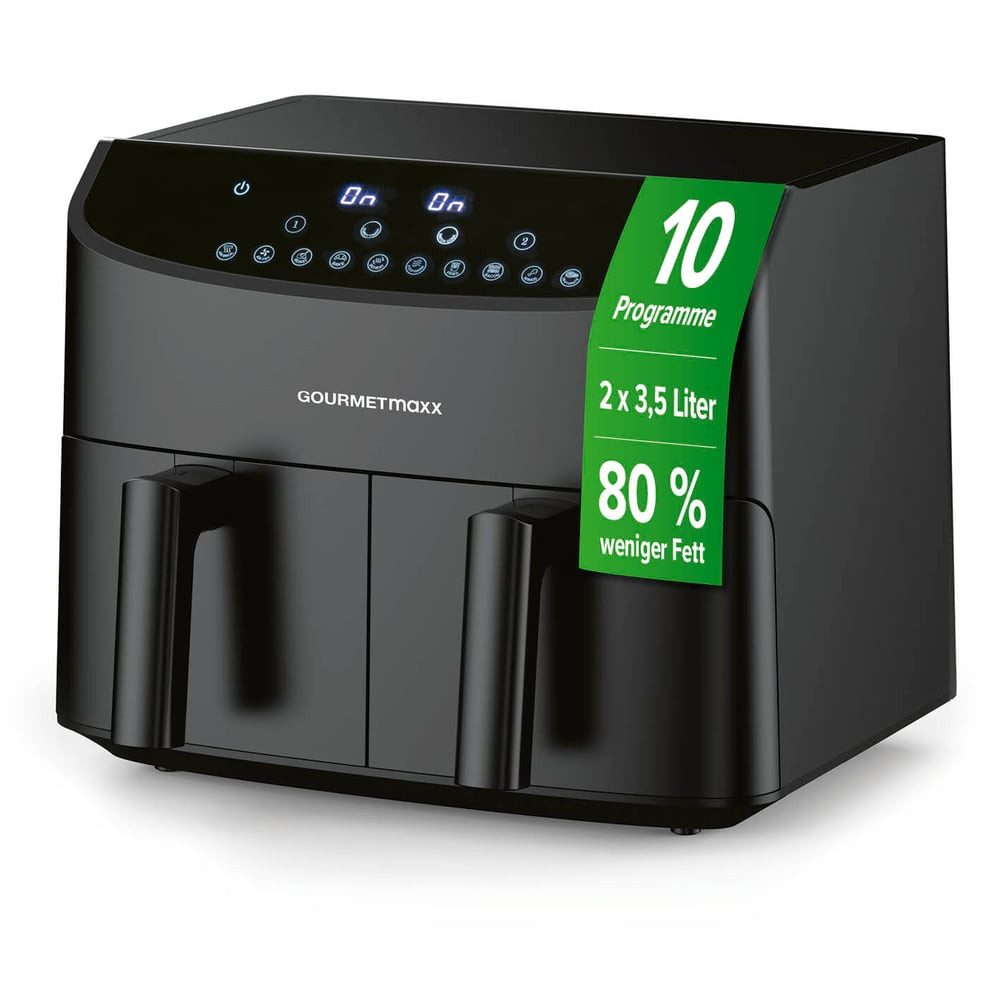 Pommes nahezu ohne zusätzliches Fett frittieren? Mit der Doppelkammer-Heißluftfritteuse von GOURMETmaxx geht das!