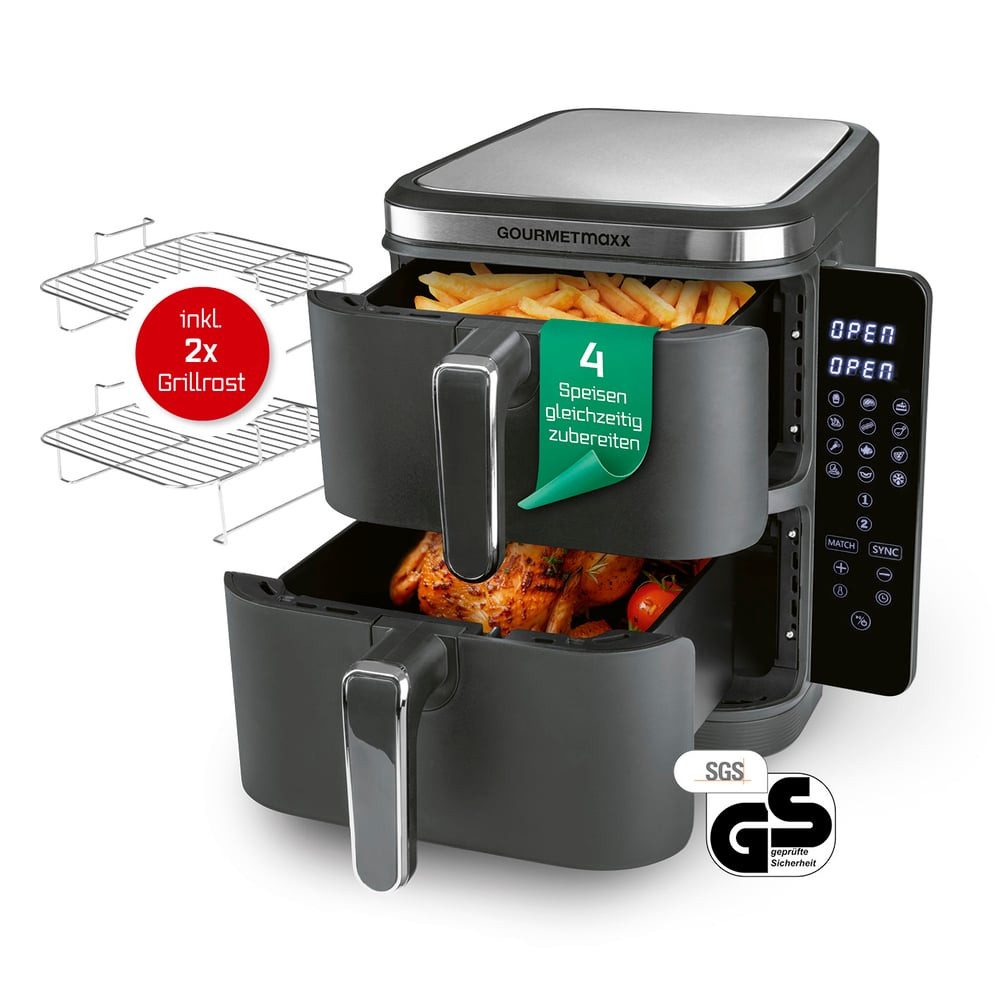 Entdecke mit der platzsparenden GOURMETmaxx FryUp Doppelkammer-Heißluftfritteuse die Freude am Kochen – fettarm & geruchsarm!