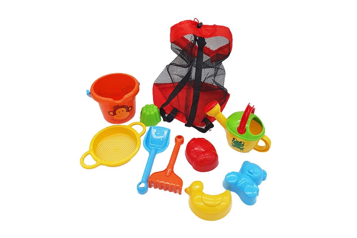 Lieferumfang | 1 x Eimer / 1 x Gießkanne / 1 x Sieb / 1 x Schaufel 22m / 1 x Rechen 19cm / 4 x Sandformen / 1 x Rucksack |