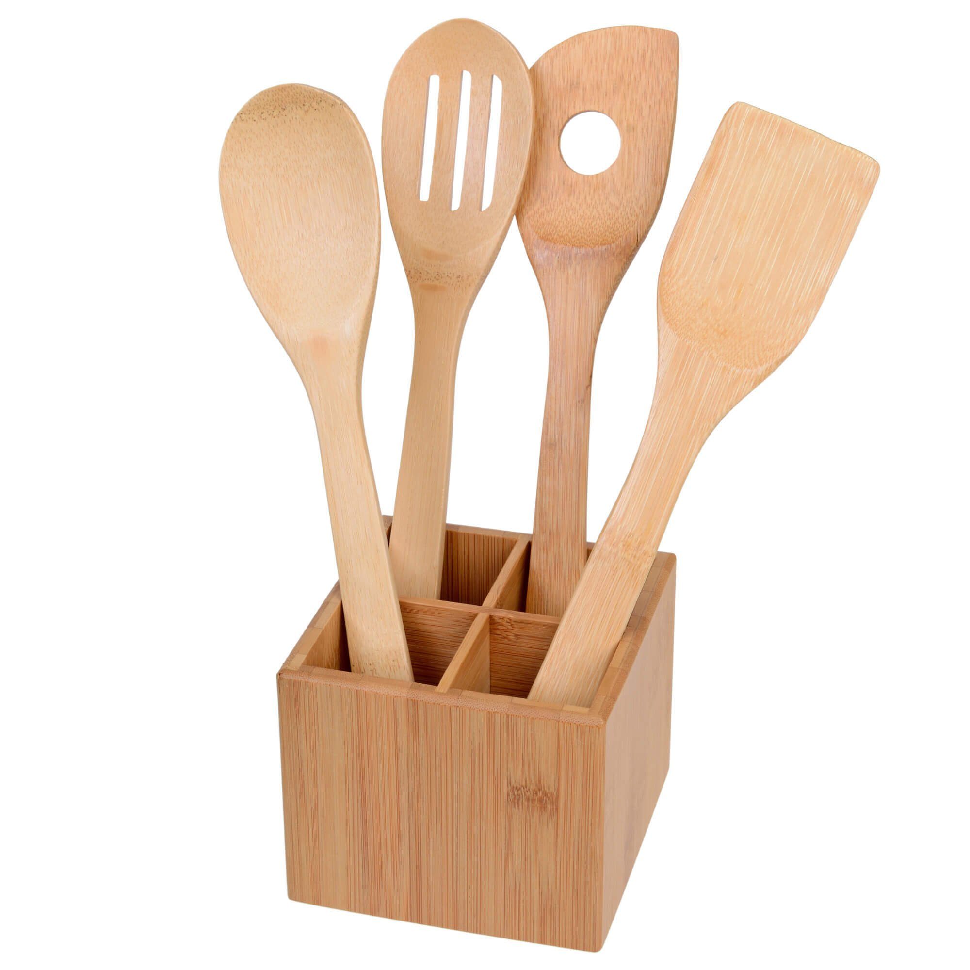 Schönes Set bestehend aus einer Aufbewahrungsbox mit 4 Fächern und Kochlöffeln aus der naturbelassenen und umweltfreundlichen Grasart Bambus mit natürlicher Maserung.