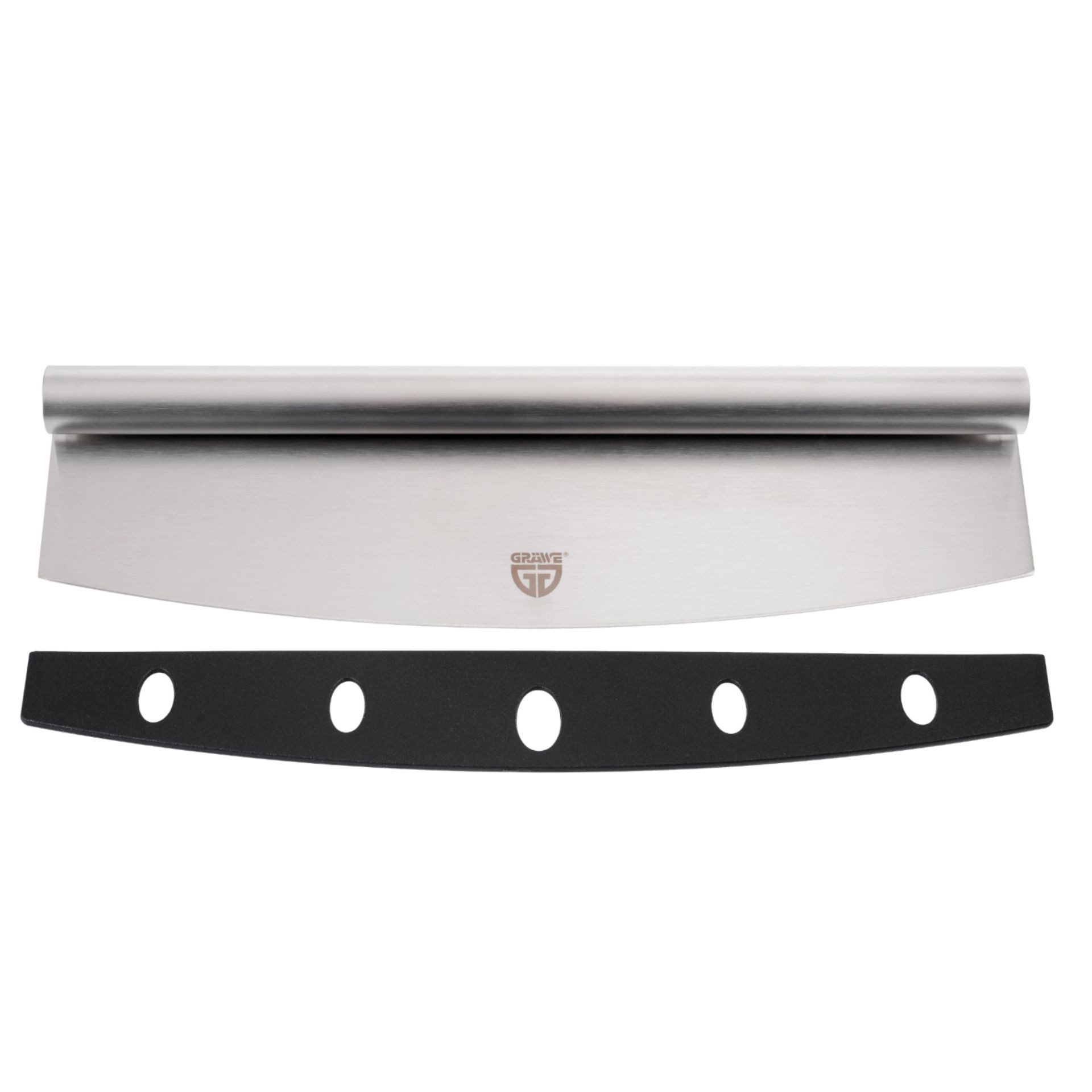 Modernes Pizzamesser in edlem Design Material: Edelstahl gebürstet Griff in eingerollter Form Klinge leicht gewölbt für Wiegeschnitt, ohne Verrutschen des Belages GRÄWE-Logo mittig gelasert Klingenschutz aus Kunststoff schwarz
