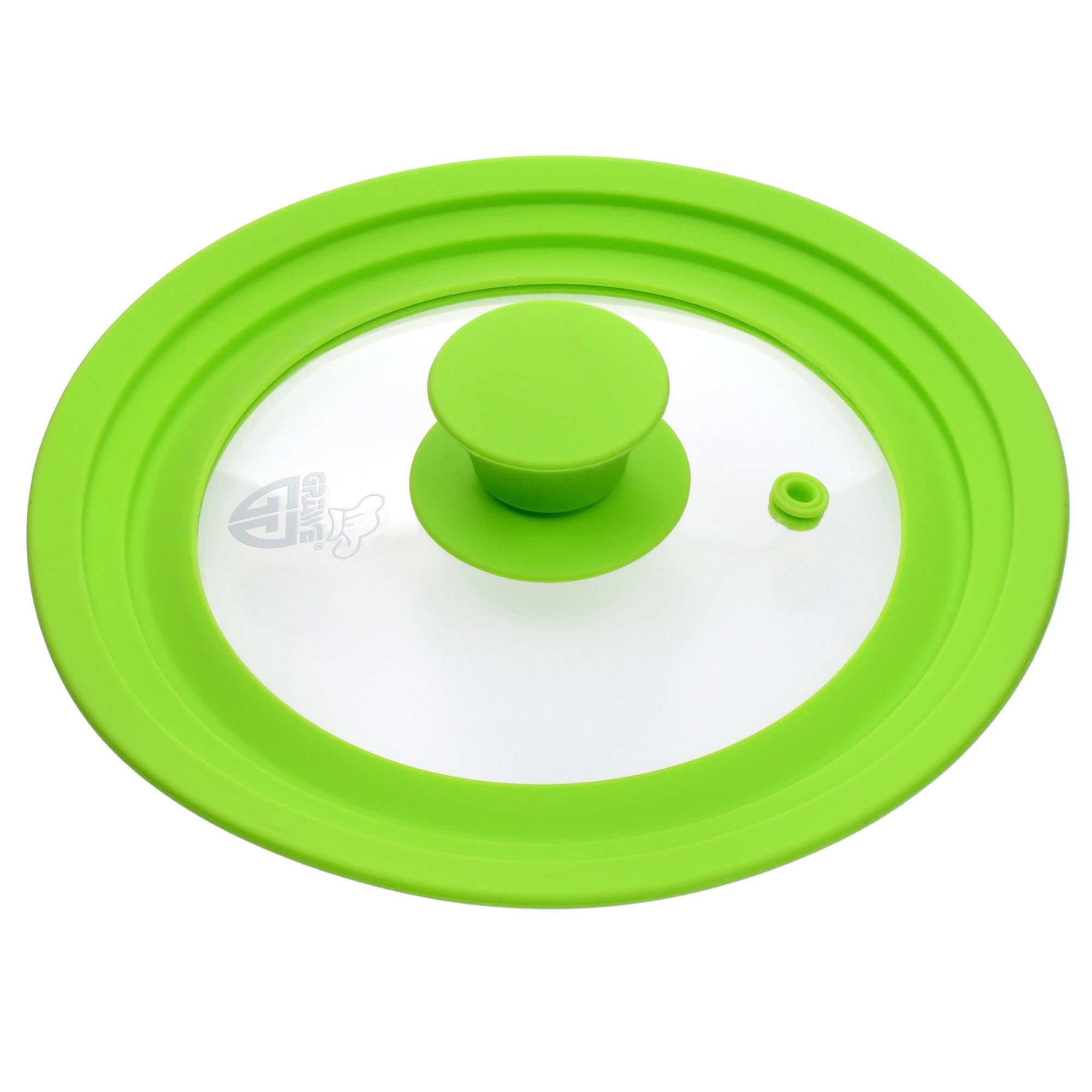 Der Glasdeckel für Töpfe und Pfannen besteht aus gehärtetem Glas und verfügt über einen Silikonrand. Da er für unterschiedliche Größen einsetzbar ist, hat dieser einen breiten abgestuften Rand.