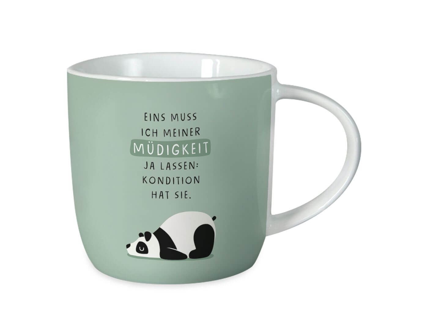 Tasse in weiß/grün mit dem Spruch "Eins muss ich meiner Müdigkeit ja lassen: Kondition hat sie."
