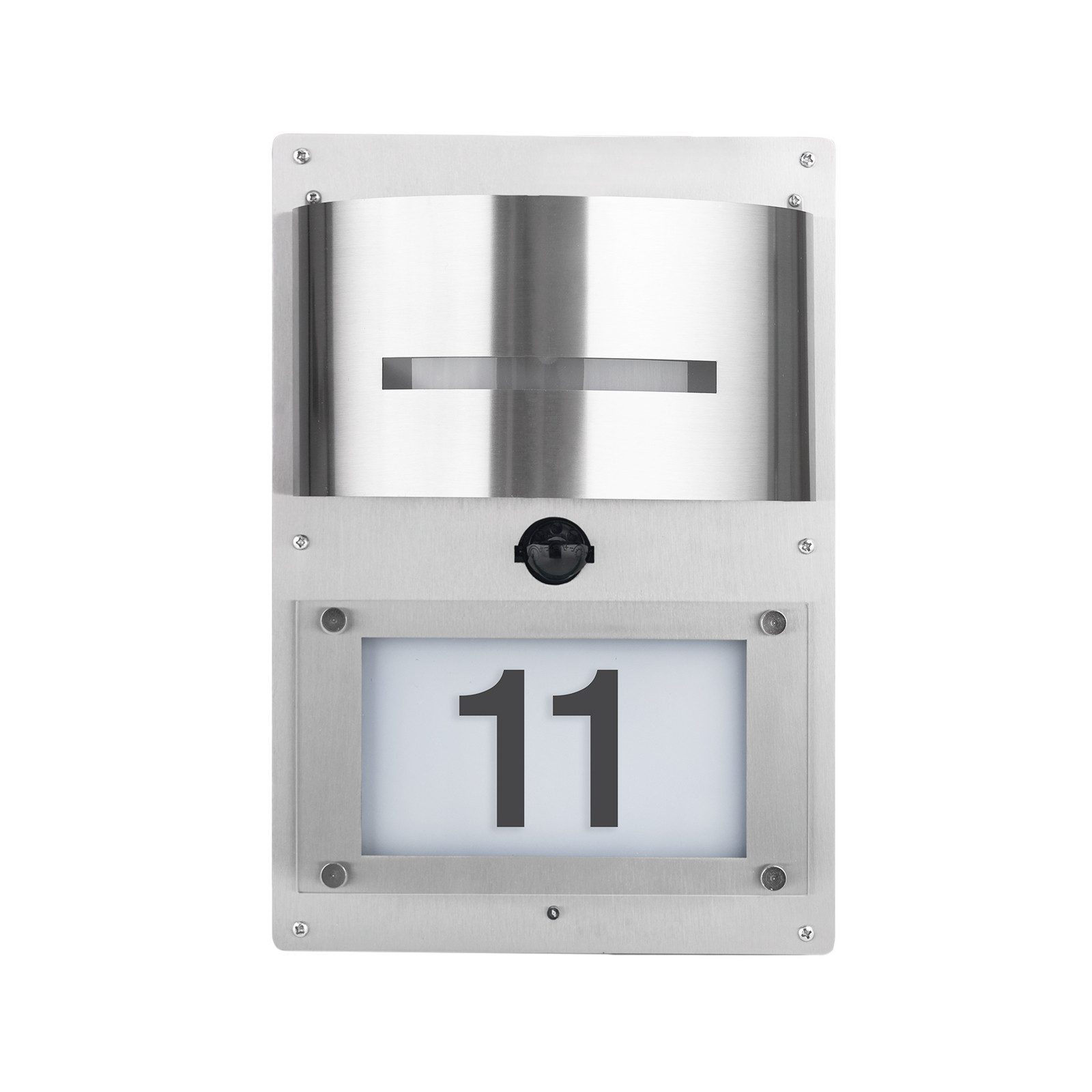 Lieferumfang | 1x Edelstahl- Wandlampe- 88HN 3x Klebefolien mit Ziffern von 0-9 und Buchstaben von A-D Befestigungsmaterial Bedienungsanleitung |