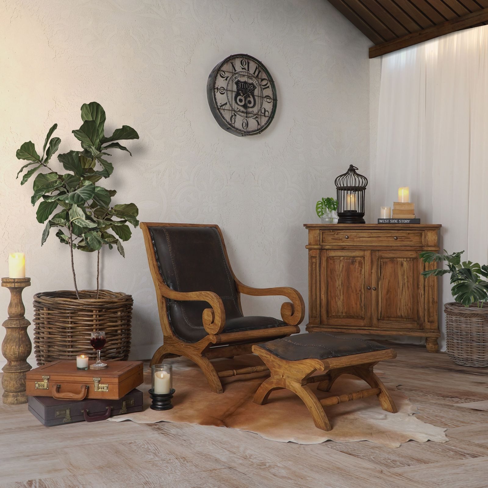 Der Ledersessel mit Hocker BAHIA vereint elegantes Design mit höchstem Komfort. Gefertigt aus hochwertigem Mahagoni-Holz in natürlichem Antik-Finish, strahlt dieses Möbelstück zeitlose Eleganz aus. Der großzügige Sessel mit einer Sitzbreite von 96 cm und einer Tiefe von 59 cm bietet ein entspannendes Sitzerlebnis, während der passende Hocker zusätzlichen Komfort für die Beine bietet. Mit seinen kompakten Maßen eignet sich das Set perfekt für Wohnräume, Bibliotheken oder Leseecken. Die robuste Verarbeitung und die edlen Materialien machen den Ledersessel BAHIA zu einem langlebigen Begleiter.