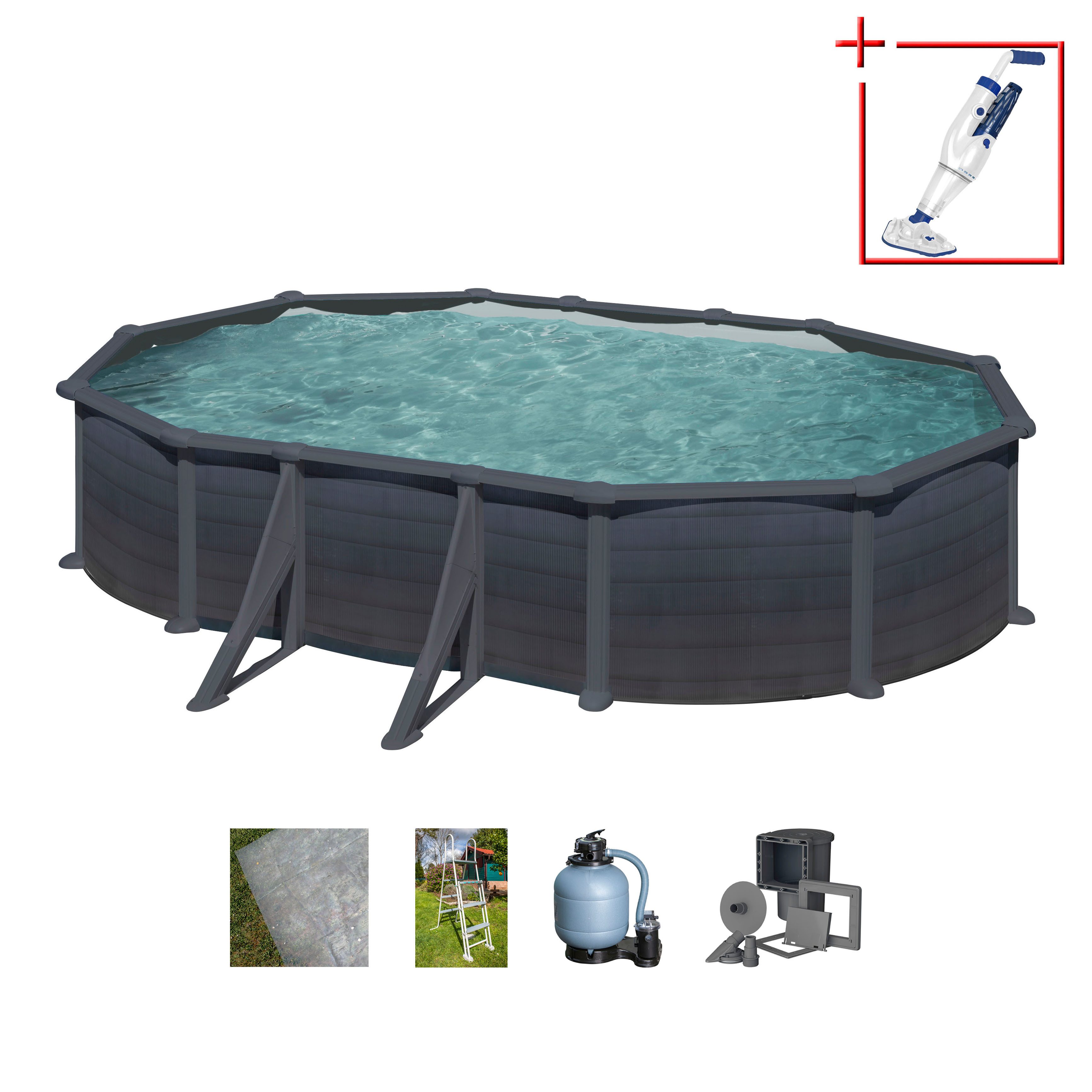 Die vorgeformte und farblich passende, je nach Modell, graue oder blaue PVC-Innenhülle ist dank ihrer Anti-UV-Behandlung und der hohen Materialstärke äußerst langlebig und legt sich von innen optimal an die Poolstruktur. Eine Sicherheitsleiter sorgt zugleich für einen sicheren und angenehmen Einstieg in den Pool und verhindert bei Nichtverwendung des Pools unerwünschten Zutritt. Vervollständigt wird der umfangreiche Lieferumfang, je nach Modell, durch eine passende Kartuschen- oder Sandfilteranlage inklusive des benötigten Filtermediums, eine kraftvolle Pumpe, ein Skimmerset, ein Bodenschutzvlies und falls erforderlich ein zusätzliches Befestigungssystem oder außenliegende Seitenstützen.