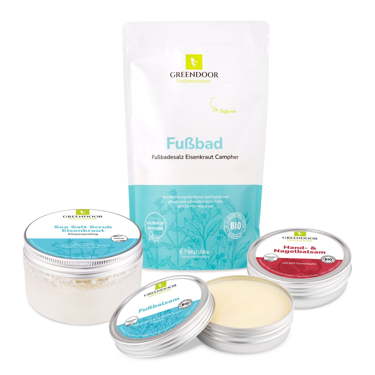 Perfekt auf die Hand- und Fußpflege abgestimmtes Produktset mit Fußbad, einem Eisenkraut-Peeling, Hand- und Nagelbalsam und Fußbalsam.