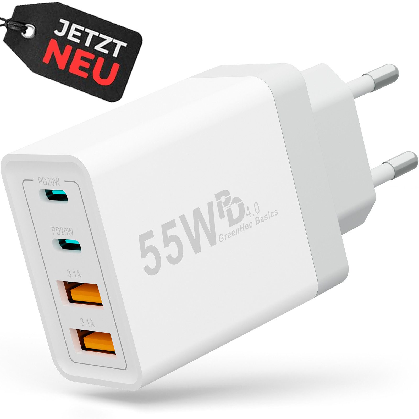 Der GreenHec 55W Quatro Charger ist dein smarter Ladebegleiter für unterwegs und zuhause. Mit satten 55 Watt Gesamtleistung, zwei 20W USB-C Ports und Platz für vier Geräte gleichzeitig, bringt er Ordnung ins Ladekabel-Chaos und sorgt für blitzschnelles Laden, egal ob iPhone, Samsung, Tablet oder Kopfhörer.