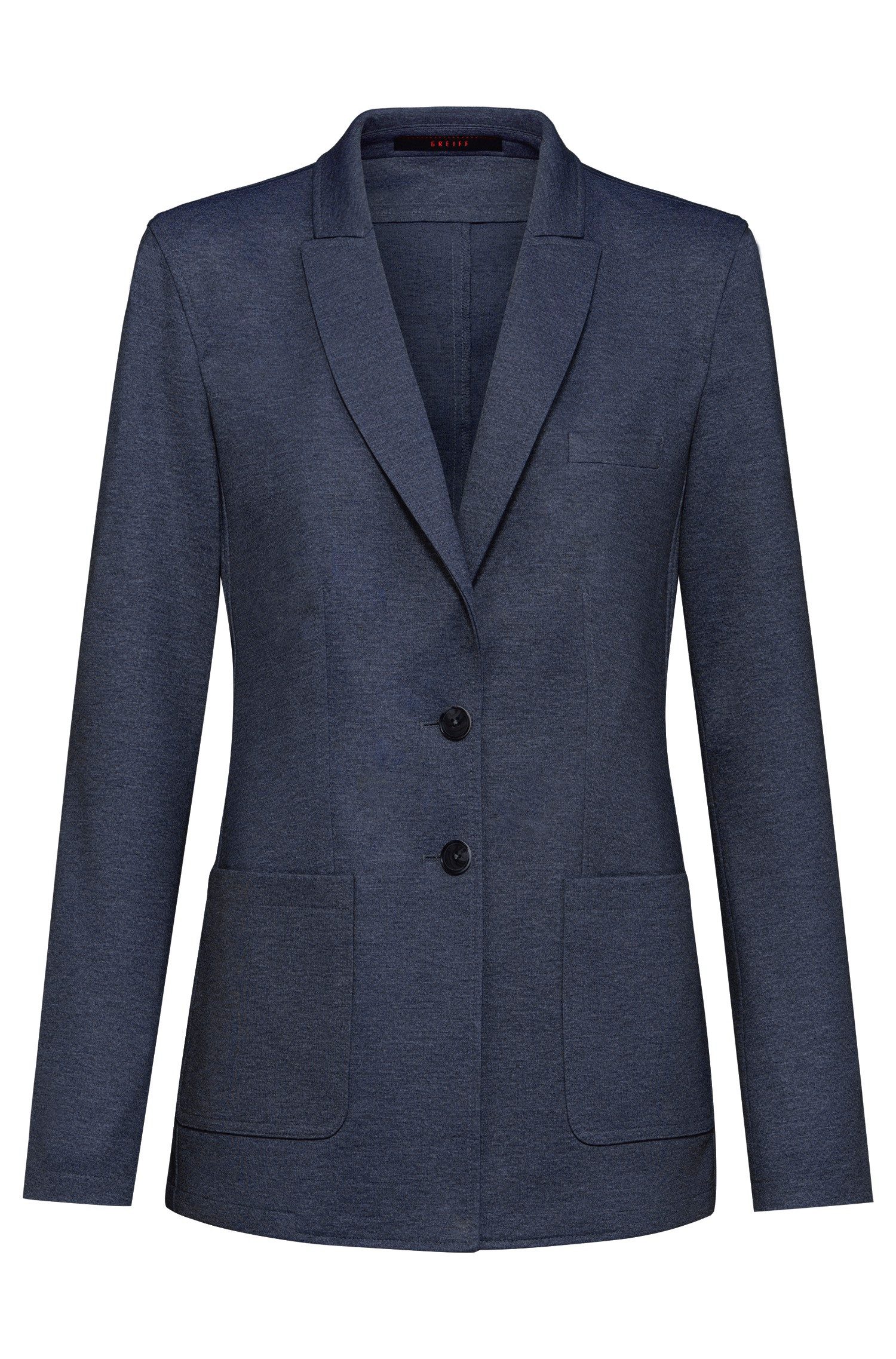 Gerade, etwas länger geschnittener Damen-Blazer aus der GREIFF - CASUAL Kollektion. Der weiche, elastische Jersey macht diesen 2-Knopf-Blazer zum bequemen Begleiter, mit dem Sie immer gepflegt auftreten. Klassische Elemente wie das Revers in Spitzfacon runden den Look ab. Mit 2 aufgesetzten Taschen, einer Brustleistentasche und Seitenschlitzen. Das Mischgewebe ist pflegeleicht und angenehm zu tragen.