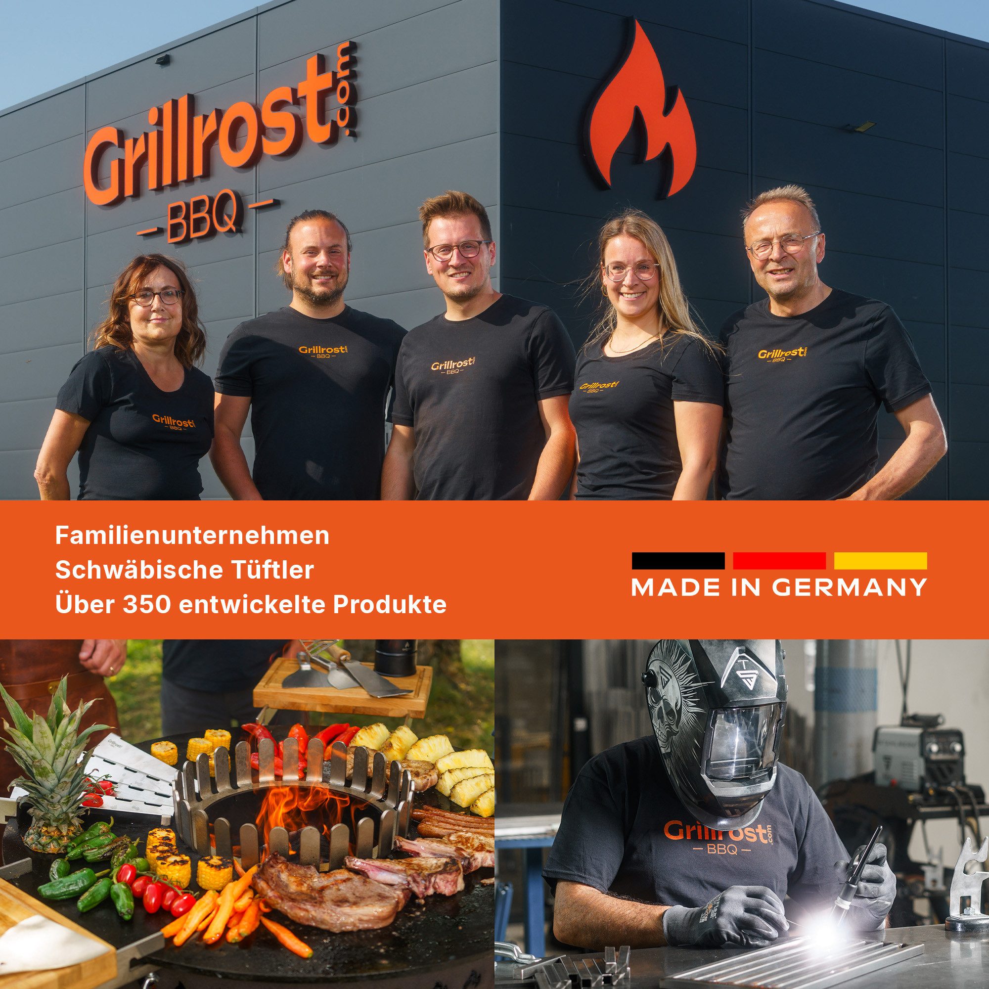 Hochwertige Verarbeitung: Gefertigt aus robustem, hitzebeständigem Edelstahl und produziert in Deutschland. Langlebig, pflegeleicht und für den intensiven Einsatz am Gasgrill gemacht.