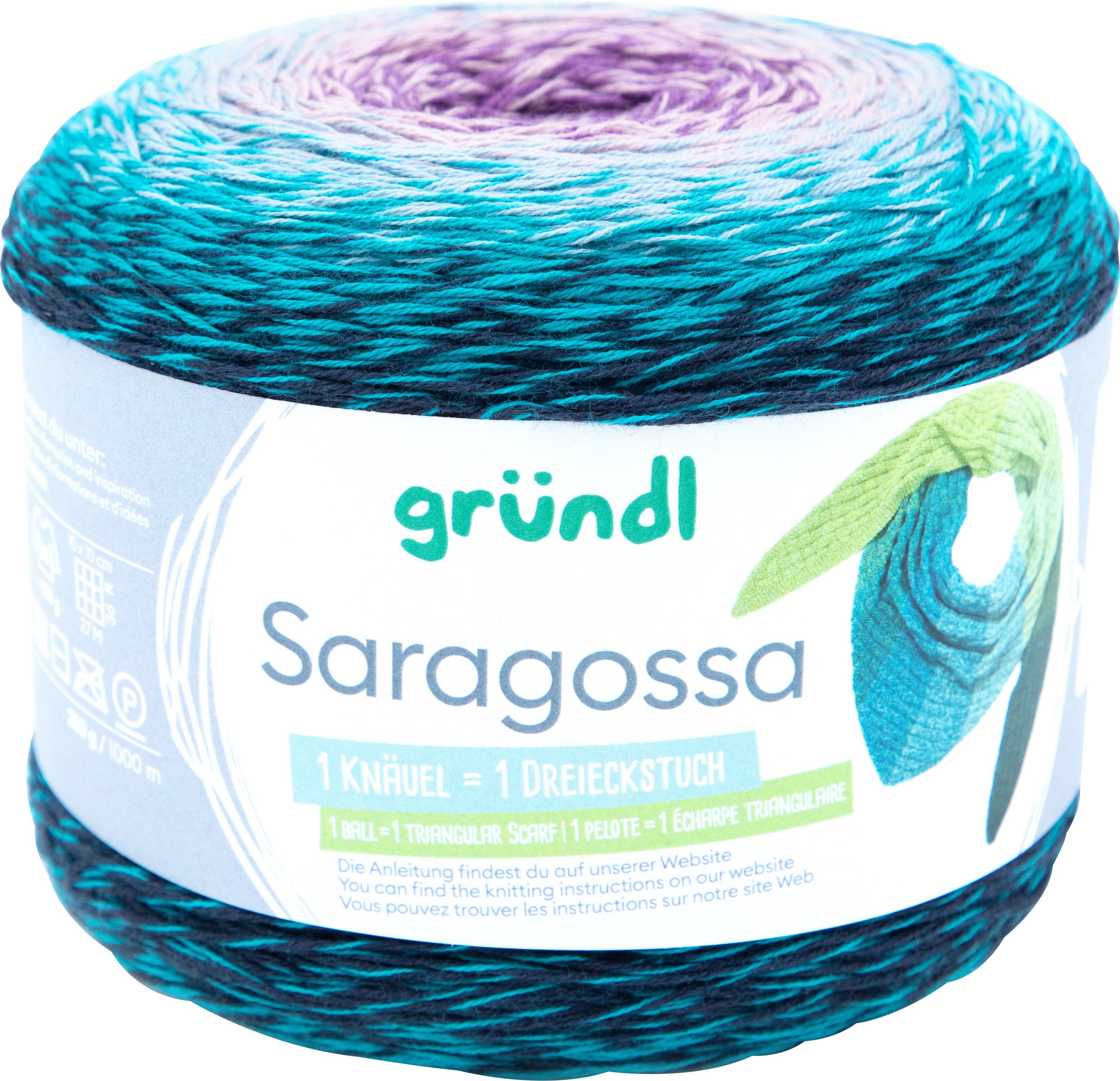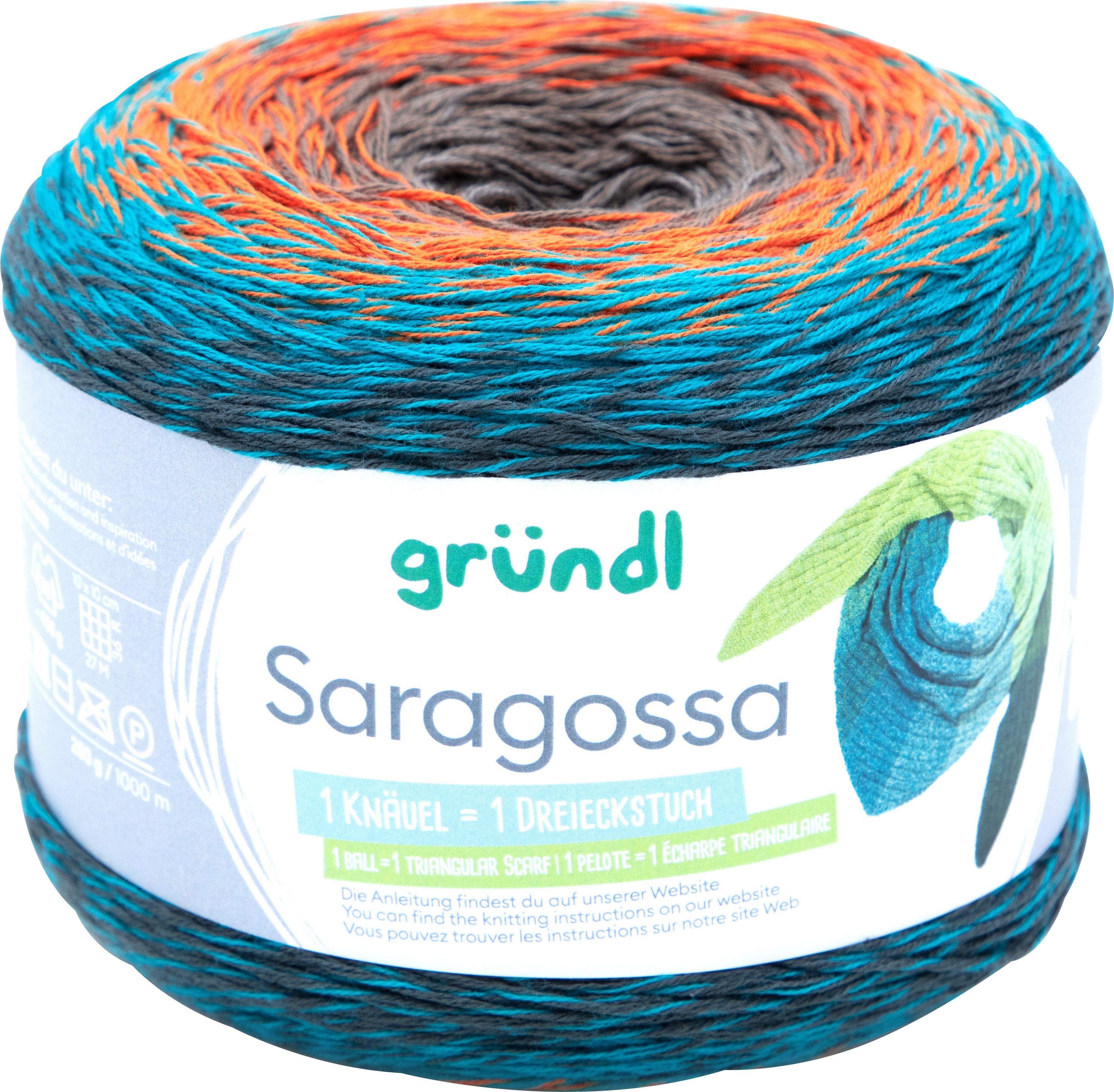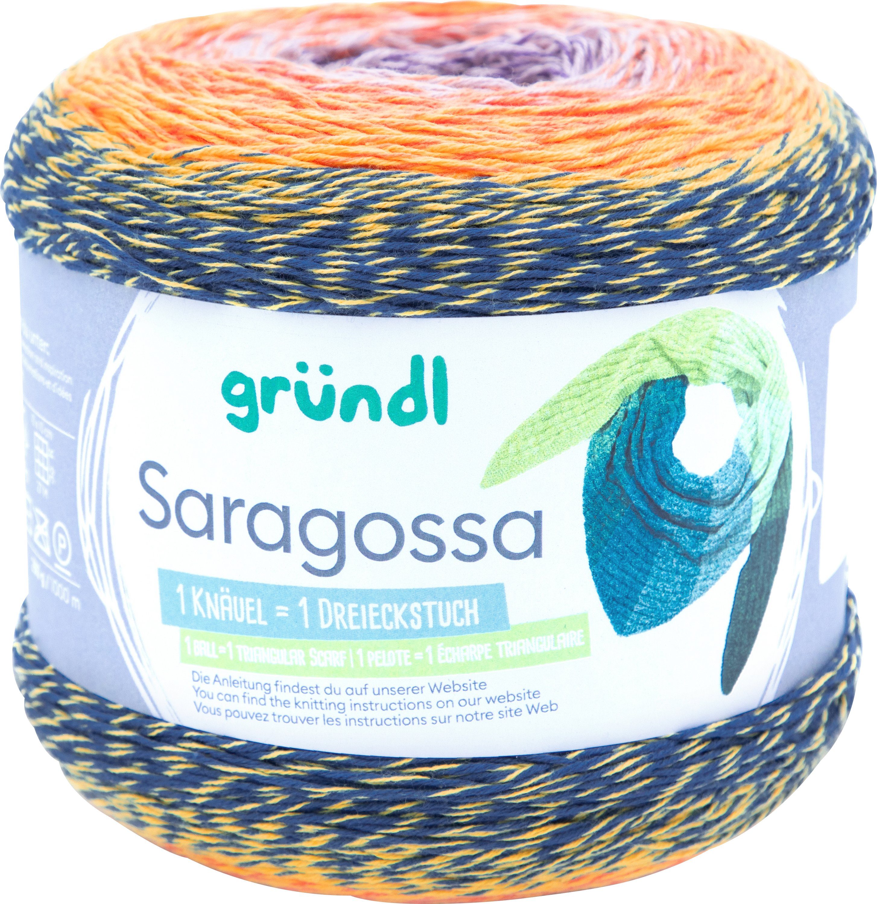 Gründl Saragossa, ca. 250 g schwer mit einer Lauflänge von ca. 1000 m. 4-fädiges Farbverlaufsgarn aus 50 % Baumwolle und 50 % Polyacryl. Pflegeleicht und formstabil. Es wiederholt sich kein Farbabschnitt und die Übergänge sind gespliced, nicht geknotet. Kann sowohl von innen nach außen als auch umgekehrt verarbeitet werden. Ideal für luftig leichte Schals, Tücher, Pullover und Shirts. Für ein Dreieckstuch wird ein Knäuel benötigt. Ein Pullover in Размер 38 wird bereits mit 400 g gestrickt oder gehäkelt.