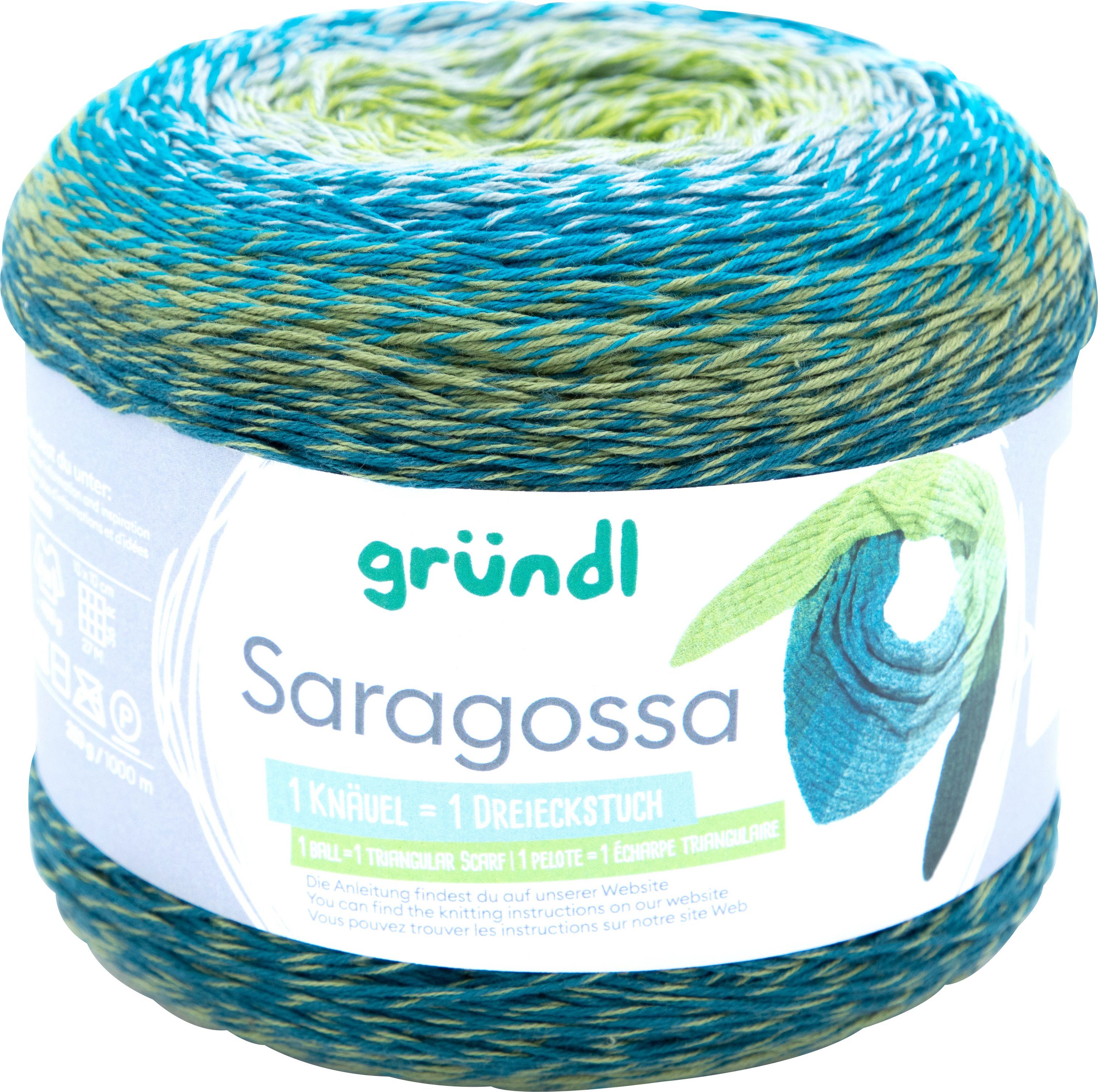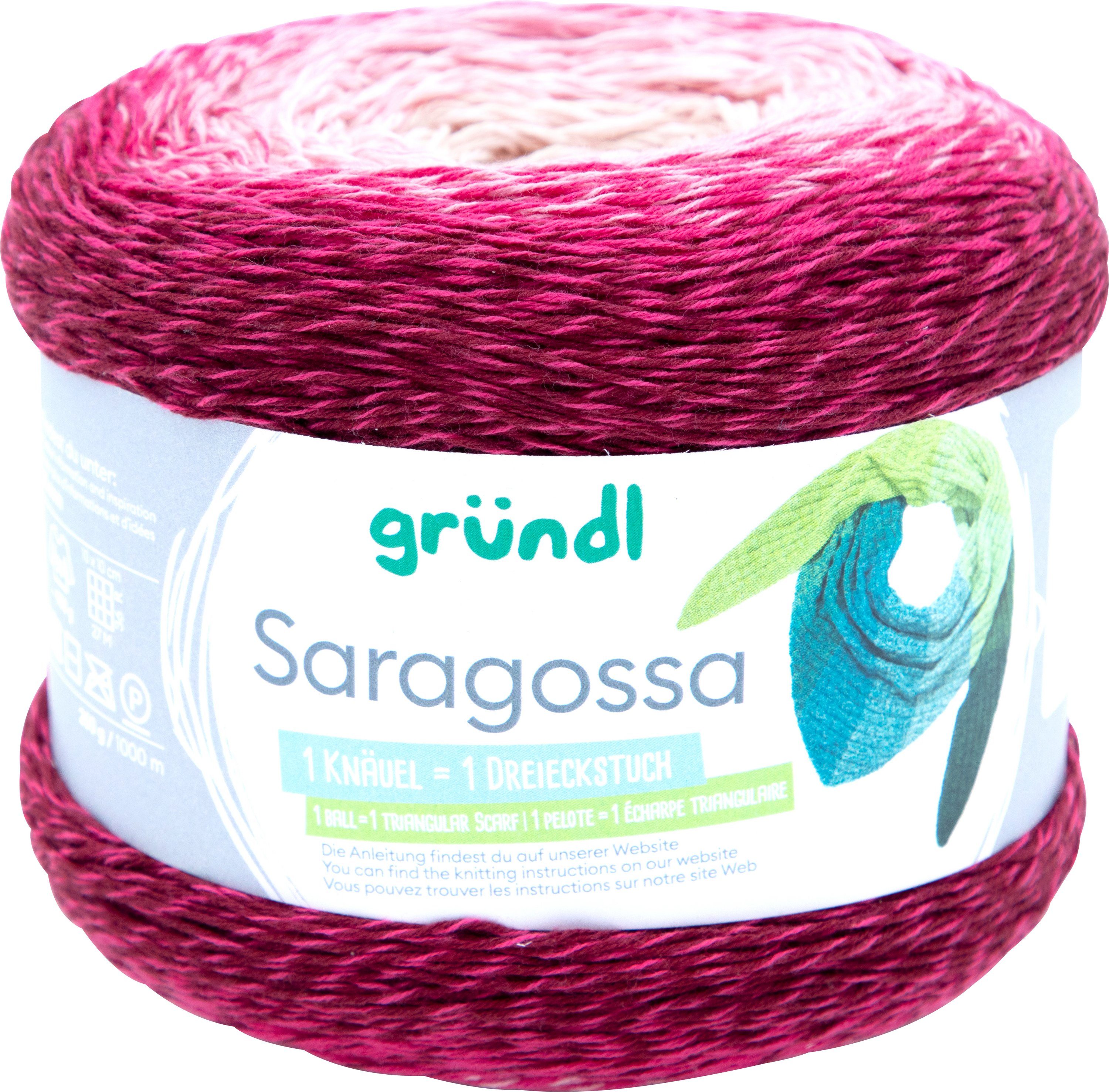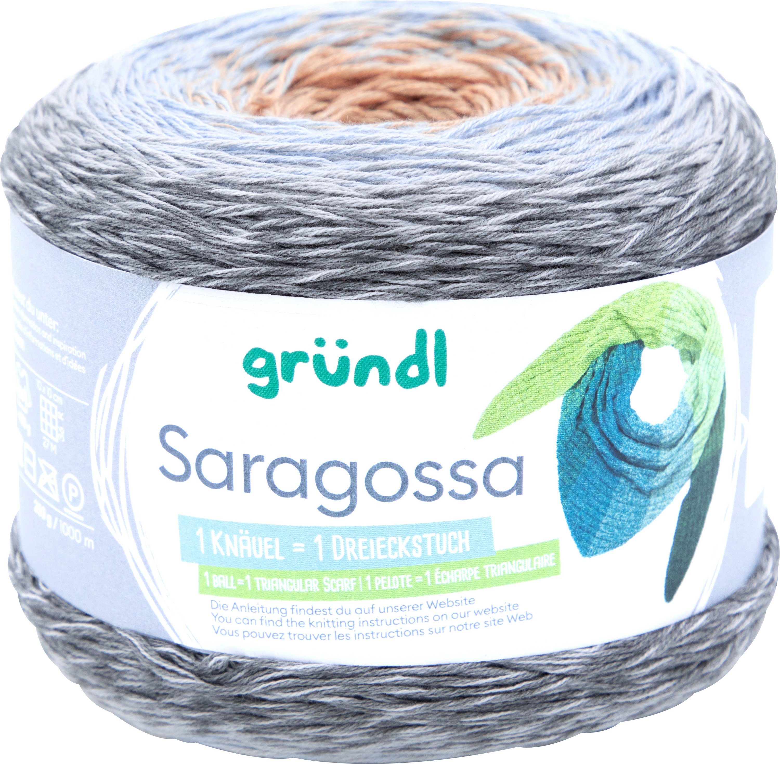 Gründl Saragossa, ca. 250 g schwer mit einer Lauflänge von ca. 1000 m. 4-fädiges Farbverlaufsgarn aus 50 % Baumwolle und 50 % Polyacryl. Pflegeleicht und formstabil. Es wiederholt sich kein Farbabschnitt und die Übergänge sind gespliced, nicht geknotet. Kann sowohl von innen nach außen als auch umgekehrt verarbeitet werden. Ideal für luftig leichte Schals, Tücher, Pullover und Shirts. Für ein Dreieckstuch wird ein Knäuel benötigt. Ein Pullover in Размер 38 wird bereits mit 400 g gestrickt oder gehäkelt.