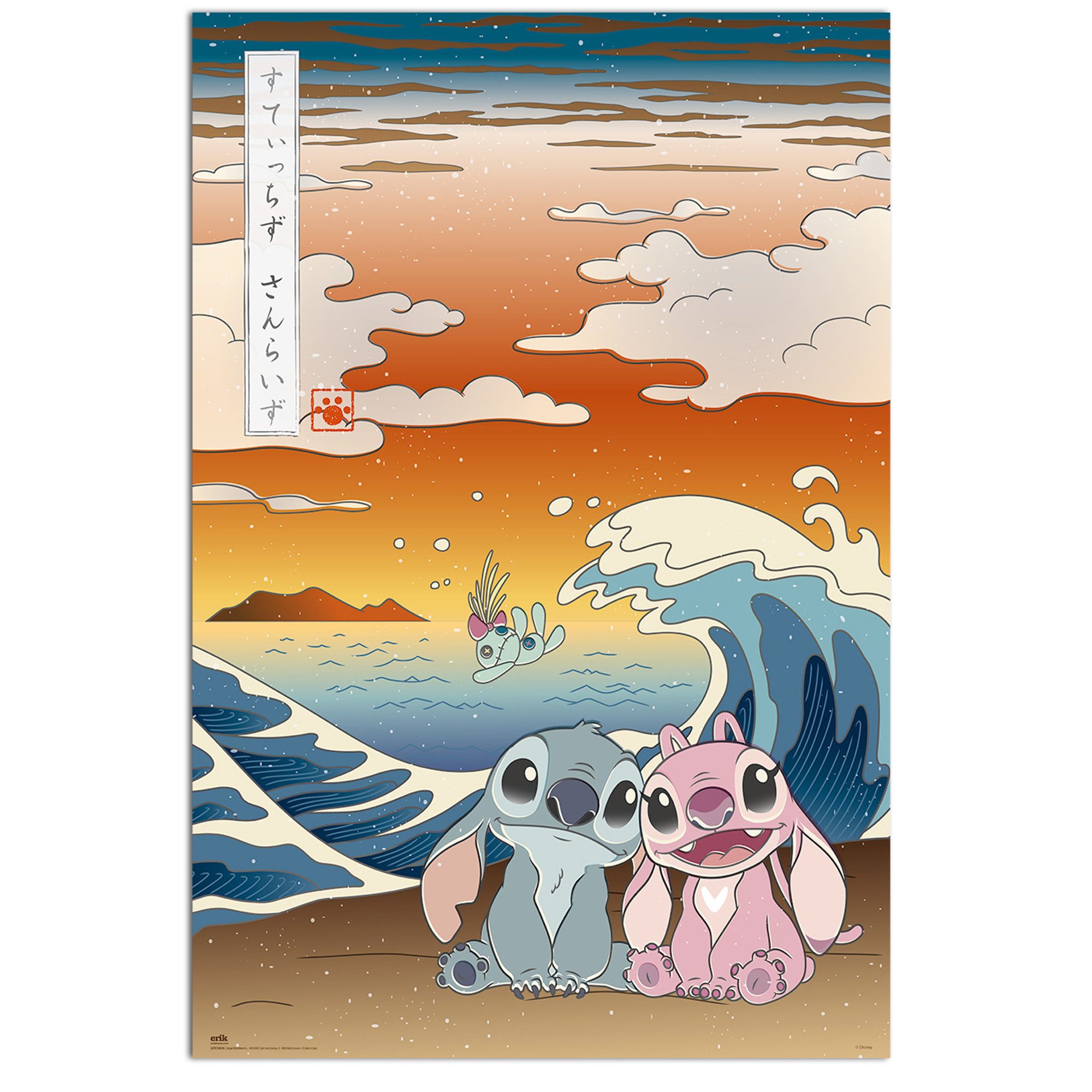 Stitch und Angel haben es sich gemütlich gemacht und genießen gemeinsam den Sonnenuntergang am Strand. Das Besondere am Poster ist die Ästhetik, die der traditionellen Kunstrichtung Ukiyo-e sehr nahe kommt.