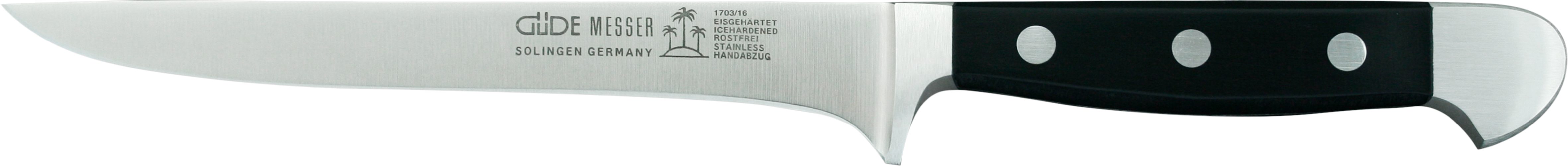 An das Klingenmaterial von Messern sind eine Fülle von Anforderungen zu stellen, die sich zum Teil widersprechen. Also gilt es, ein Optimum zwischen den verschiedenen Anforderungen zu realisieren. So soll ein Messerstahl hart sein, jedoch nicht zu hart, da er ansonsten brechen würde. Er soll aber auch nicht zu weich sein, da das Messer sonst durch Abnutzung zu schnell stumpf werden würde. Daher sind die Messer der Serie Alpha von GÜDE aus einem Chrom- Molybdän-Vanadium-Messerstahl gefertigt, der eine optimale Härte von ca. 57-58 HRc (Rockwell) hat.