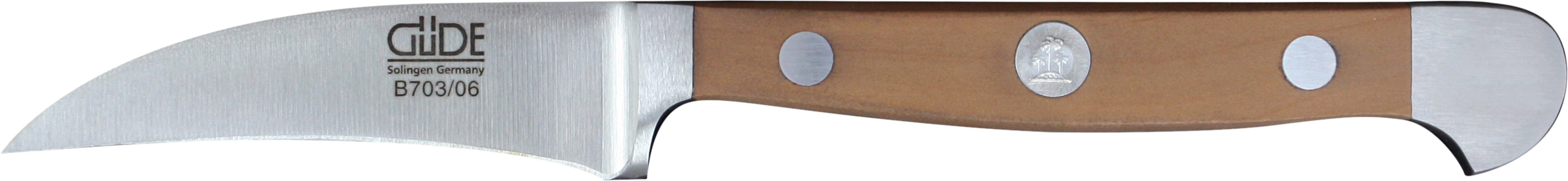 Hochwertige Messer müssen nicht nur scharf sein, sie müssen scharf bleiben, sie sollen gut in der Hand liegen und ausbalanciert sein, damit ermüdungsfreies und jederzeit sicheres Arbeiten garantiert ist. Die optimale Schärfe und Schneidhaltigkeit der Serie Alpha Birne wird sowohl durch die Härte des GÜDE Klingenstahls mit ca. 57-58 HRc (Rockwell) als auch durch den GÜDE Watenwinkel von ca. 33 Grad sichergestellt. Die Griff-Form, der durchgehende Erl und der für GÜDE unverkennbare Doppelkropf machen aus den Messern der Serie Alpha Birne ein Werkzeug, das perfekte Handhabung und Ausbalancierung garantiert.