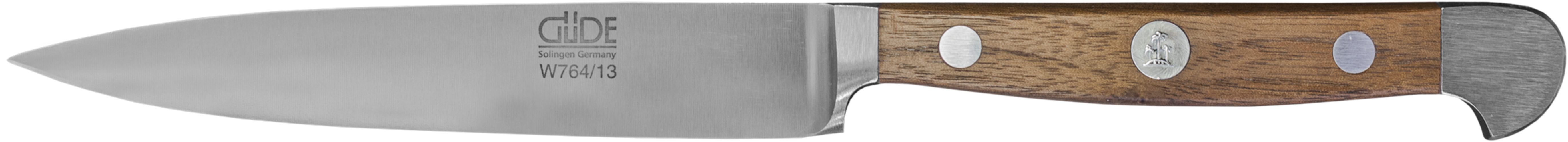 Ein gutes Messer sollte nicht nur scharf sein, es sollte auch möglichst lange scharf bleiben. Ein gutes Messer soll darüber hinaus gut in der Hand liegen und ausbalanciert sein, so dass ermüdungsfreies und jederzeit sicheres Arbeiten garantiert ist. Schärfe und Schneidhaltigkeit der Serie Alpha Walnuss werden sowohl durch die optimale Härte des GÜDE Klingenstahls mit ca. 57-58 HRc (Rockwell) wie auch durch den GÜDE Watenwinkel von ca. 33 Grad sichergestellt. Die Form des Griffes, der Voll-Erl und der für GÜDE typische Doppelkropf machen aus den Messern der Serie Alpha Walnuss ein zuverlässiges Werkzeug, das perfekte Handhabung und Ausbalancierung garantiert.