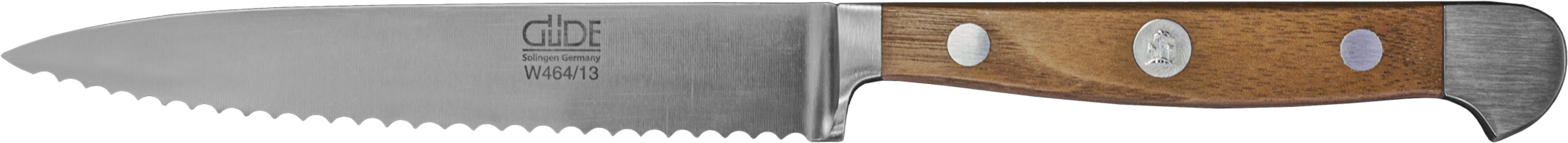 Ein gutes Messer sollte nicht nur scharf sein, es sollte auch möglichst lange scharf bleiben. Ein gutes Messer soll darüber hinaus gut in der Hand liegen und ausbalanciert sein, so dass ermüdungsfreies und jederzeit sicheres Arbeiten garantiert ist. Schärfe und Schneidhaltigkeit der Serie Alpha Walnuss werden sowohl durch die optimale Härte des GÜDE Klingenstahls mit ca. 57-58 HRc (Rockwell) wie auch durch den GÜDE Watenwinkel von ca. 33 Grad sichergestellt. Die Form des Griffes, der Voll-Erl und der für GÜDE typische Doppelkropf machen aus den Messern der Serie Alpha Walnuss ein zuverlässiges Werkzeug, das perfekte Handhabung und Ausbalancierung garantiert.