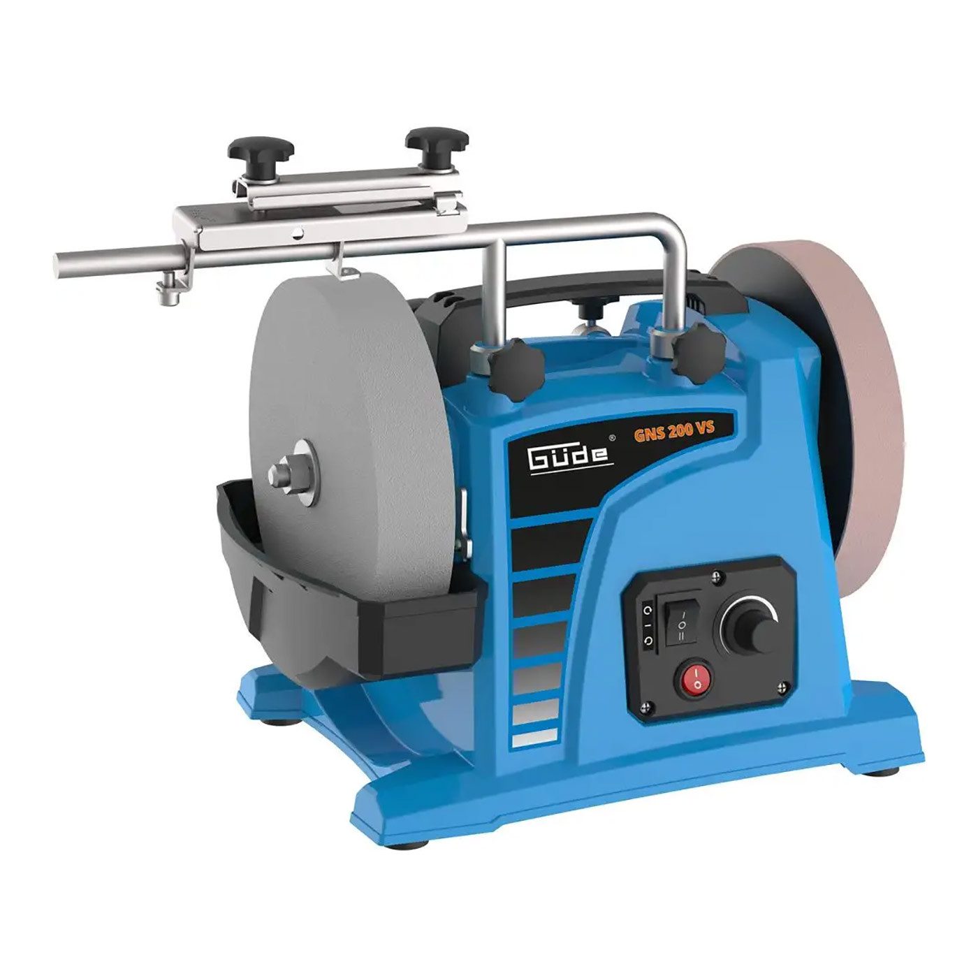Nie wieder stumpfe Scheren, Äxte oder Messer. Mit dem Güde Nassschleifer GNS 200 VS halten Sie ihre Werkzeuge wie Kerbwerkzeuge, Spalter oder Hobel jederzeit in Form. Perfekt für einen Heim- und Handwerker. Ein stabiler Maschinenfuß sorgt jederzeit für laufruhige und vibrationsarme Schleifarbeiten. Darüber hinaus punktet der GNS 200 VS mit stufenloser Geschwindigkeitseinstellung Namens Vario Speed. Selbst Werkzeugstahl über 60 HRC lassen sich mit dem Nassschleifer bearbeiten. Auch die inneren Werte wissen bei Güde zu überzeugen. So stattet der Hersteller das Werkzeug mit einem leistungsstarken Induktionsmotor inklusive Gleitlagerbuchsen aus. Für ausdauernde & optimale Schleifprojekte gehört ein Edelkorund-Schleifstein mit zur Grundausstattung. Mit verstellbaren Arbeitsauflagen erhält der Anwender des Güde Nassschleifer GNS 200 VS ein hohes Maß an Flexibilität. Durch zwei verschiedene Laufrichtungen im Betrieb gewährleistet die Maschine individuelles Arbeiten. Hier denkt Güde mit. Der Wassertank verfügt zudem über einen integrierten Überlaufschutz. Wozu der Wassertank? Der hochwertige Edelkorund-Schleifstein befördert das Wasser vom Wassertank nach oben. Anschließend gelingt es an die zu bearbeitende Klinge. Hierdurch überhitzt die Klinge nicht. Beschädigungen am Werkstück oder Werkzeug lassen sich effizienter vermeiden.