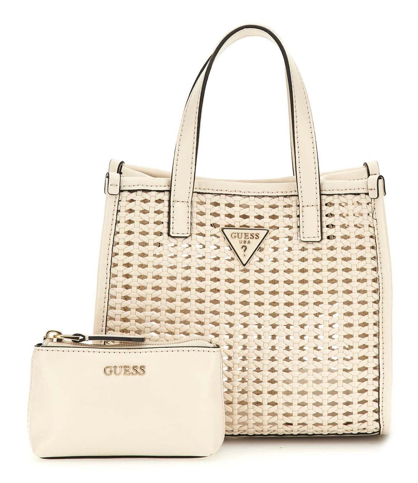 Diese Handtasche der Marke GUESS vereint Klasse und Funktionalität perfekt. Das moderne geflochtene Design passt zu jedem Outfit und Anlass. Im Inneren der Tasche finden Sie zudem eine kleine Utensilientasche, in der Sie Ihre wichtigsten Kleinigkeiten sicher und übersichtlich verstauen können. Die GUESS Brigitta Mini 2 in 1 Tote Handtasche wird eine wundervolle Ergänzung Ihrer Taschenkollektion werden.