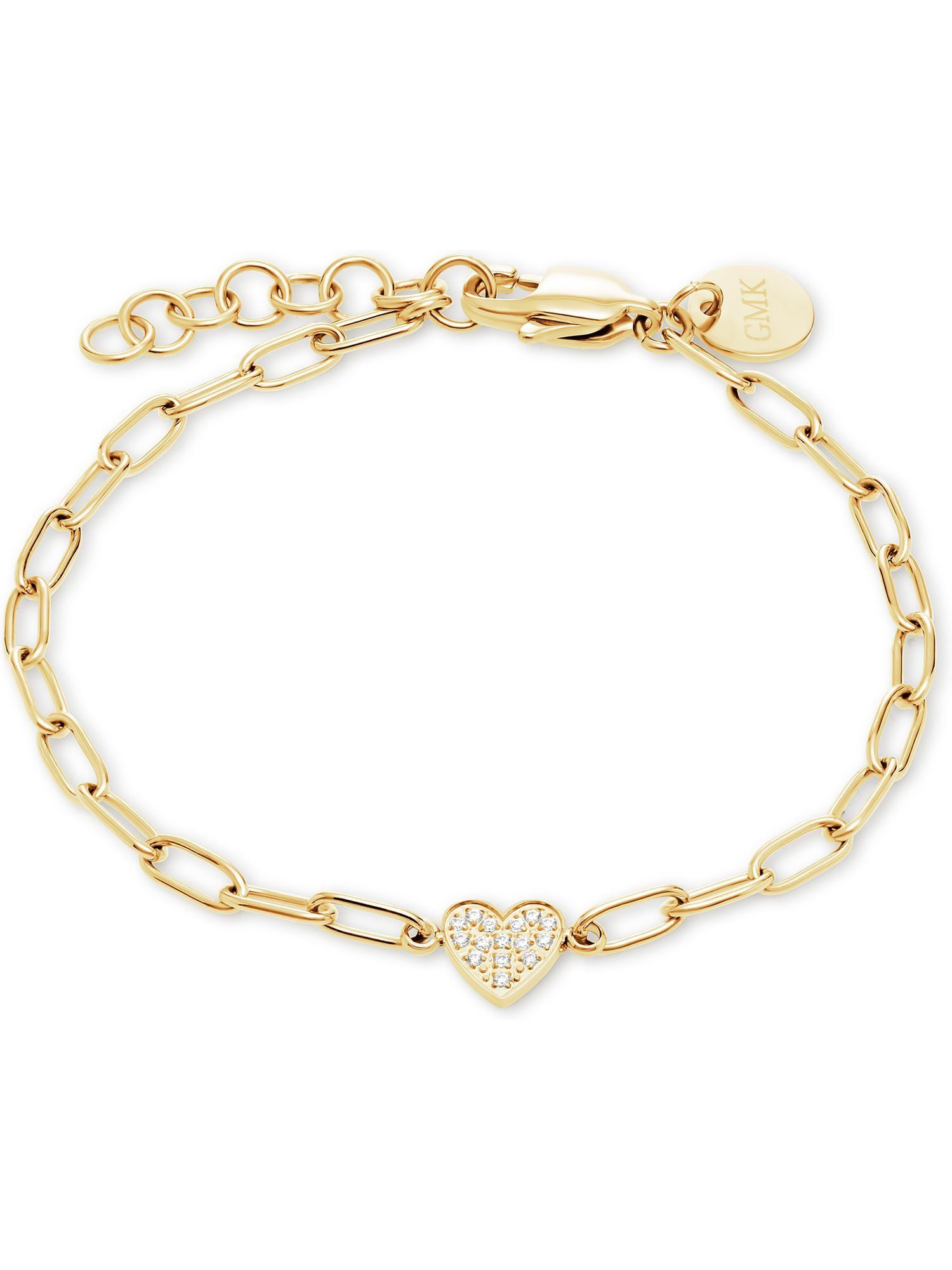Man nehme etwas Modernes und etwas Zeitloses – fertig ist dieses einzigartige Armband von Guido Maria Kretschmer aus vergoldetem Edelstahl. Die länglichen Glieder sind im trendigen Paperlink-Stil gestaltet. In ihrer Mitte thront ein Schmuckelement in Form des ewigen Liebessymbols mit weißem Farbsteinbesatz. Du trägst deine Accessoires gerne im Set? In der Kollektion des Top-Designers findest du die passende Kette zu diesem längenverstellbaren Armschmuck!