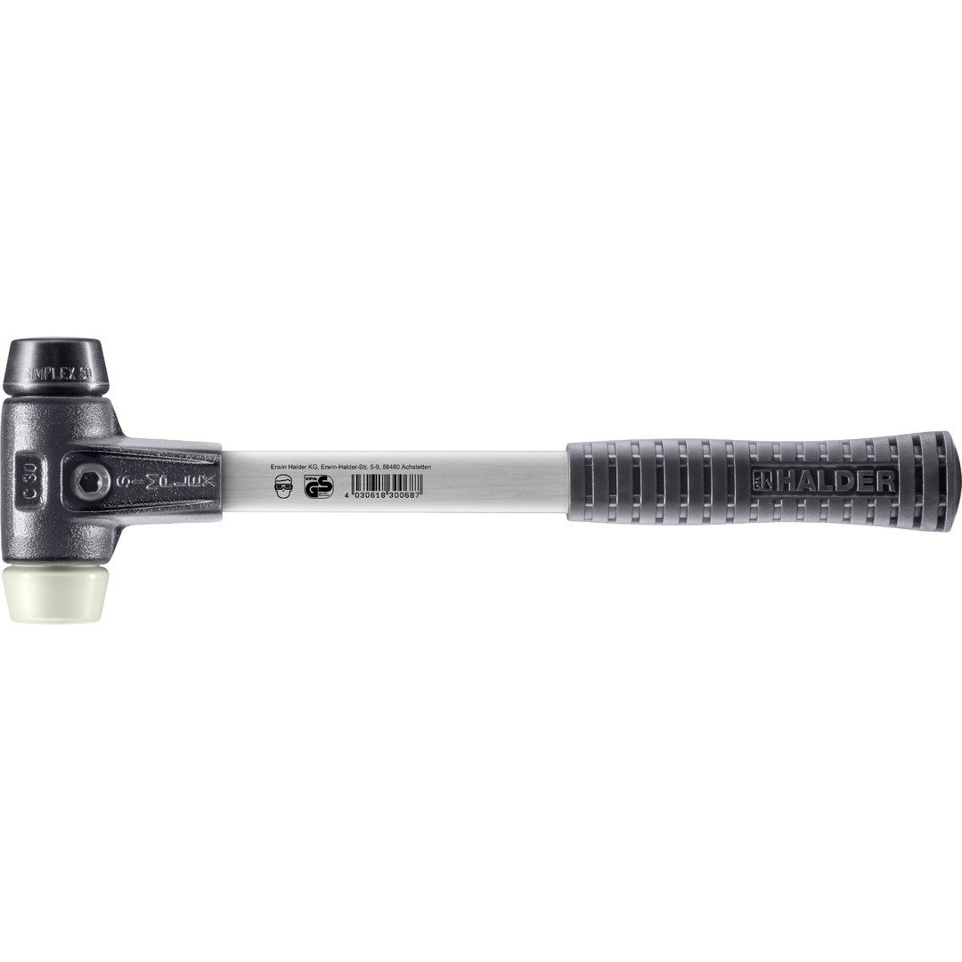 SIMPLEX–Schonhammer in der Einsatzkombination Gummikomposition (schwarz, mittelhart, dämpfend, geruchsneutral, verschleißarm) / Nylon (weiß, hart, sehr verschleißfest, kein Absplittern auch bei Minustemperaturen, öl- und fettbeständig).