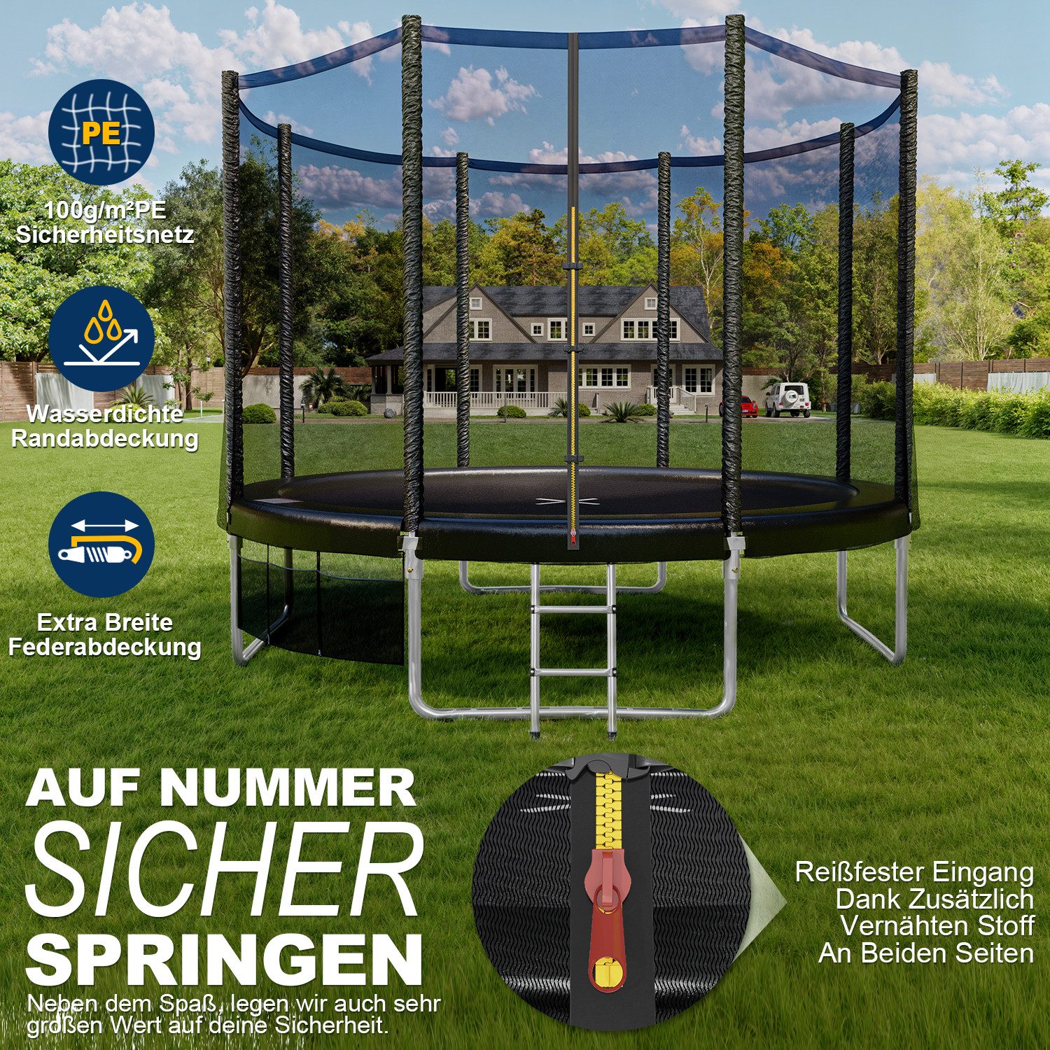Unsere sicherheitsgeprüften Trampoline bestehen aus hochfesten verzinkten Stahlfedern und Drahthaken mit größeren Rändern. Die Matte ist mit 15 mm dickem Epe-Schaum gefüllt, und die ummantelten Federn bieten weichen Halt und Schutz.