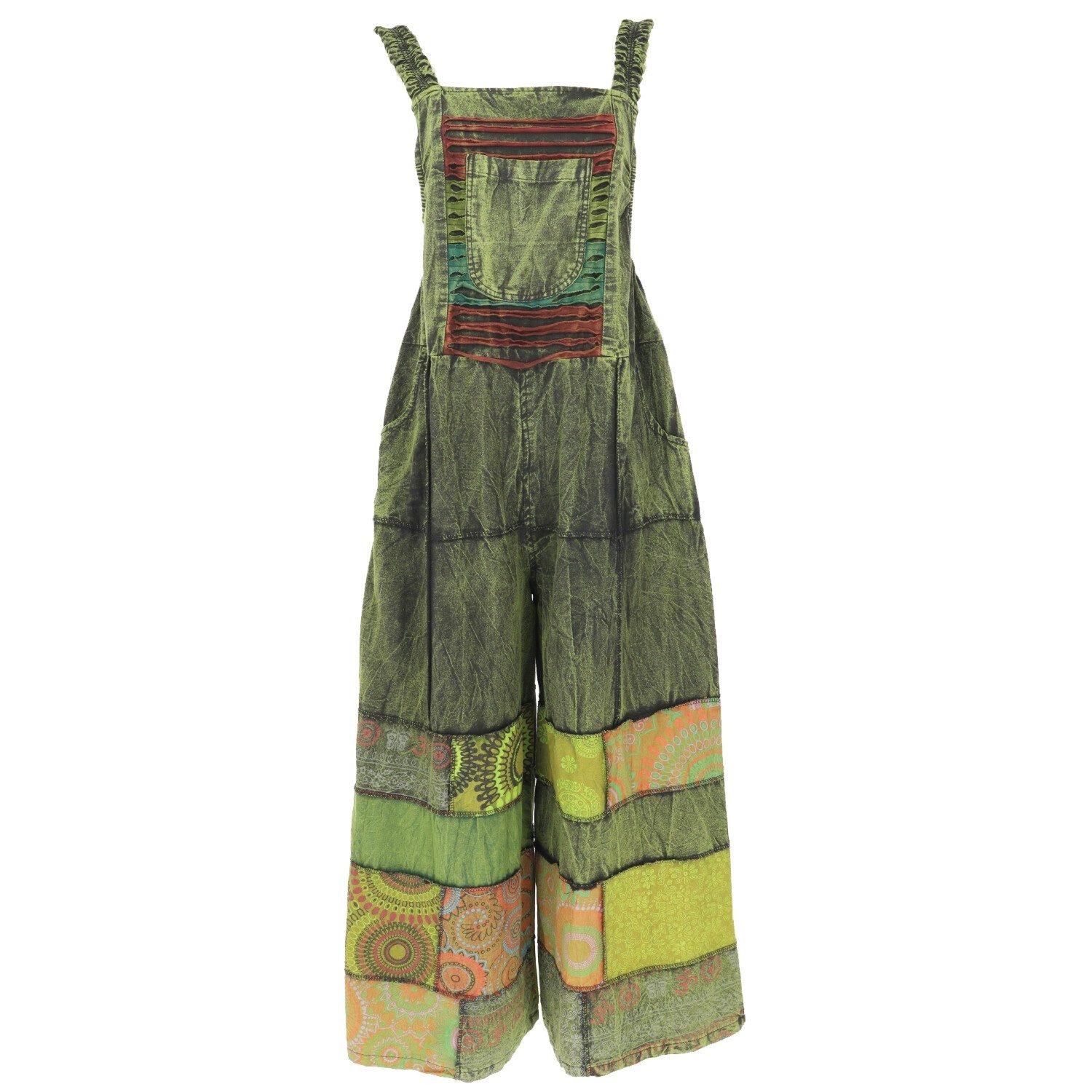 Natürliche Patchwork Boho Latzhose, Overall, Jumpsuit - grün