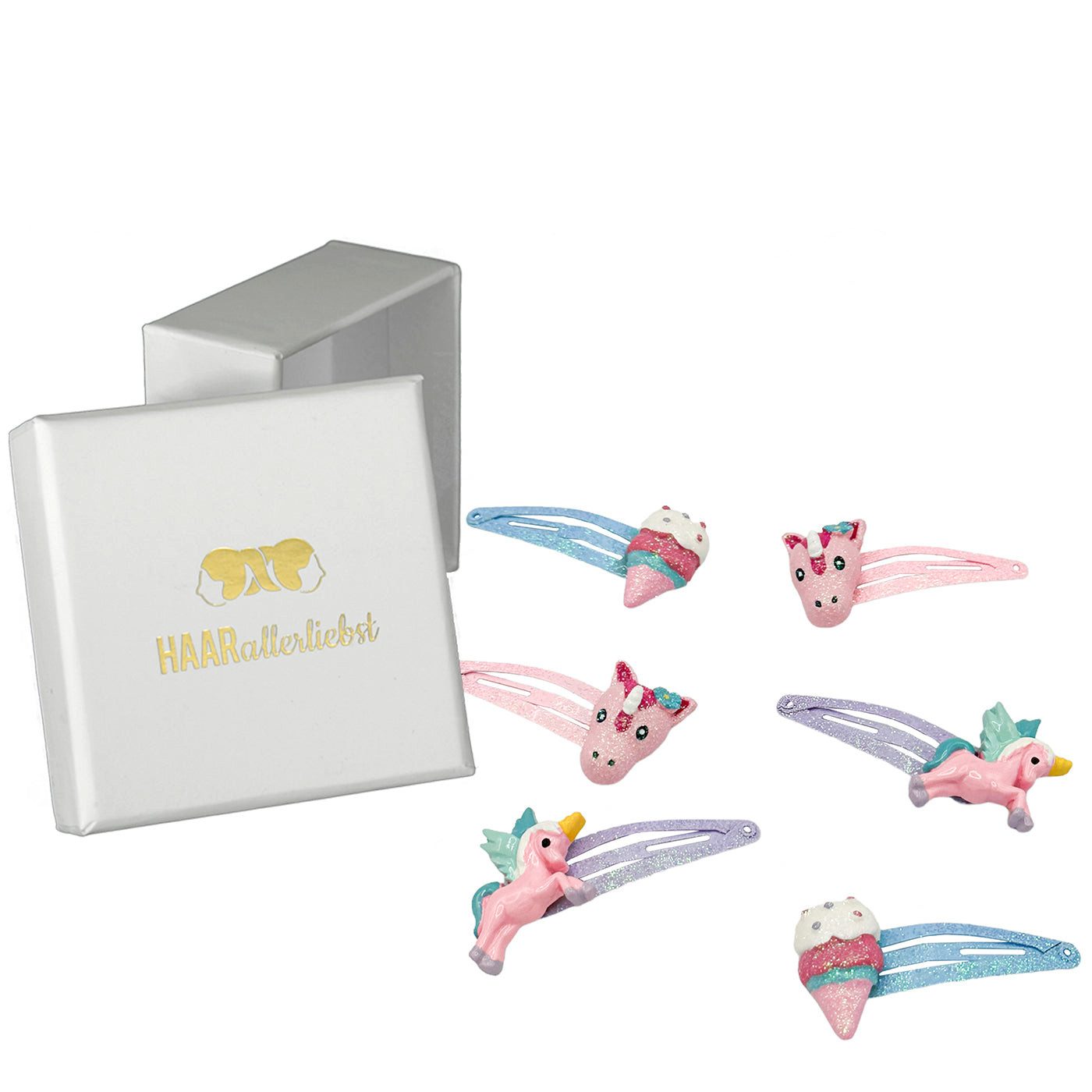 HANDBEMALTE EIS UND EINHORN HAARSPANGE SET, GLITZER, 6ER-SET