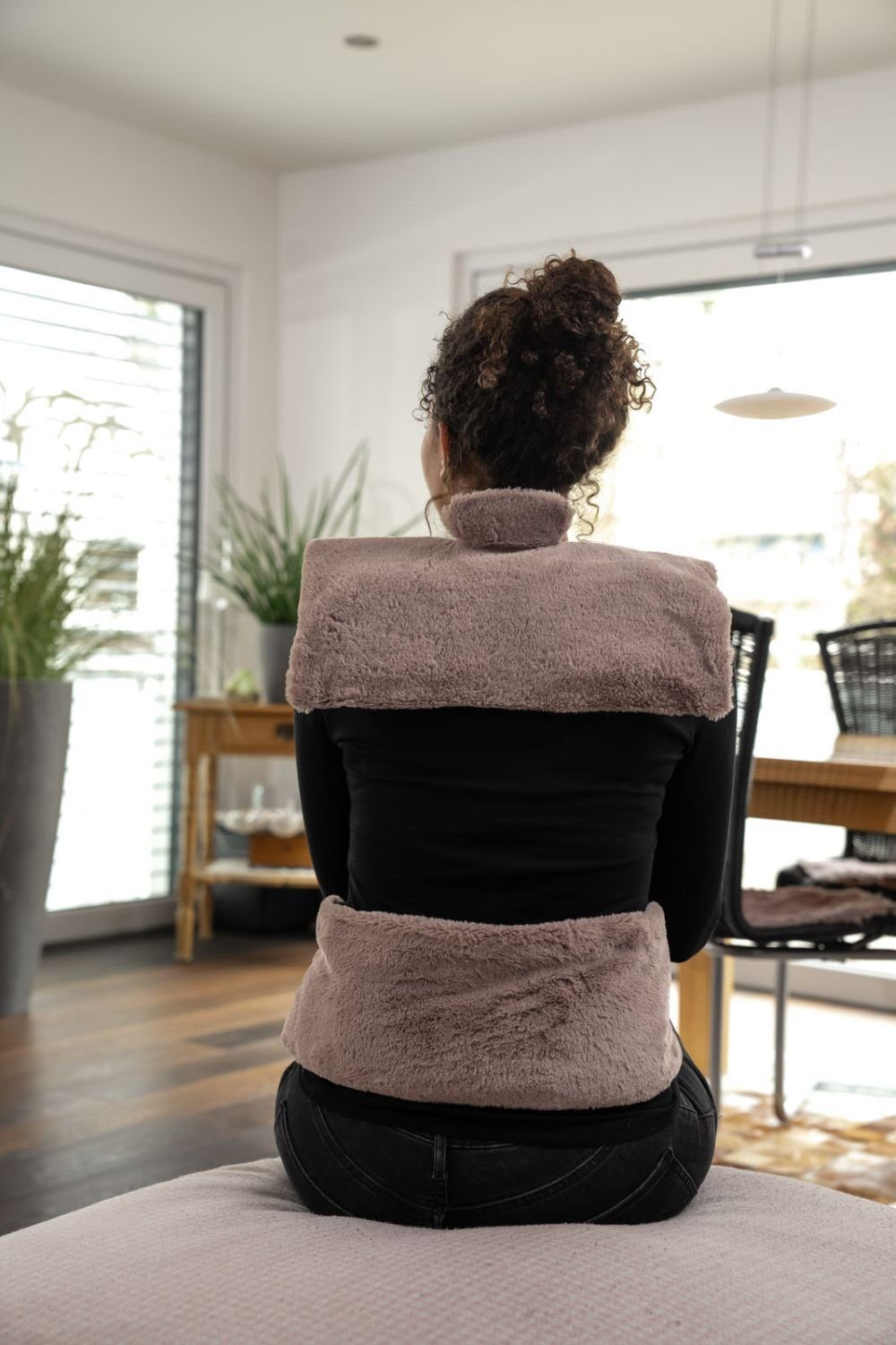 Mit seiner einzigartig großen Auflagefläche von 35 x 32 cm wärmt unser Schulter-/Rückenwärmer nicht nur großflächig die Schulterpartie, sondern auch den oberen Rücken. Auf Grund der kleinen eingebauten Lasche wird außerdem der Nacken optimal gewärmt. Die plüschig-kuschlige Außenseite sorgt hierbei für zusätzlichen Tragekomfort.