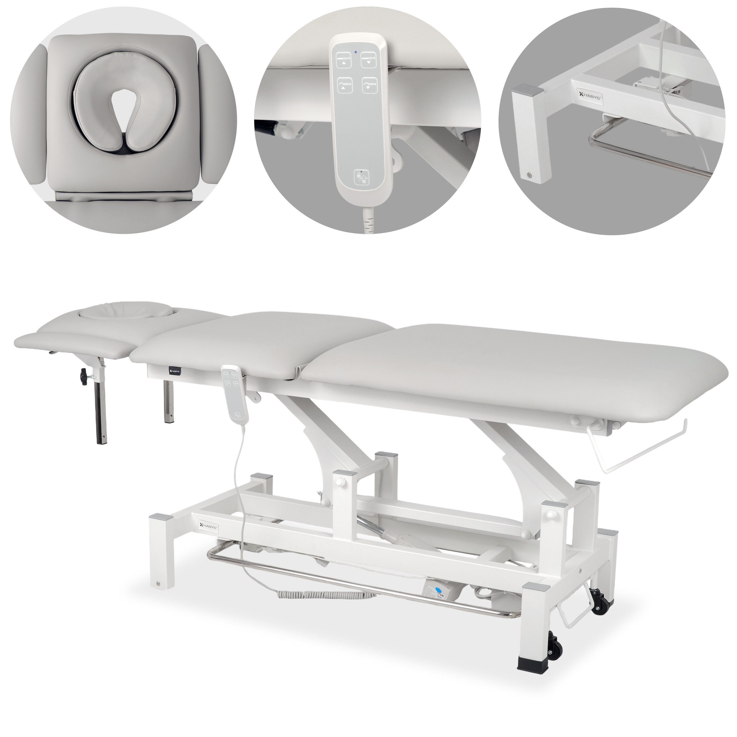 Rehabilitationsliege mit 5-segmentiger Liegefläche, ERGO-Kopfkissen, Handfernbedienung und Steuerrahmen, geeignet für den Einsatz in professionellen Massage-, Physio- und Rehabilitationspraxen. Sie wurde entwickelt, um maximalen Patientenkomfort und eine ergonomische Arbeitsweise für den Therapeuten zu gewährleisten.