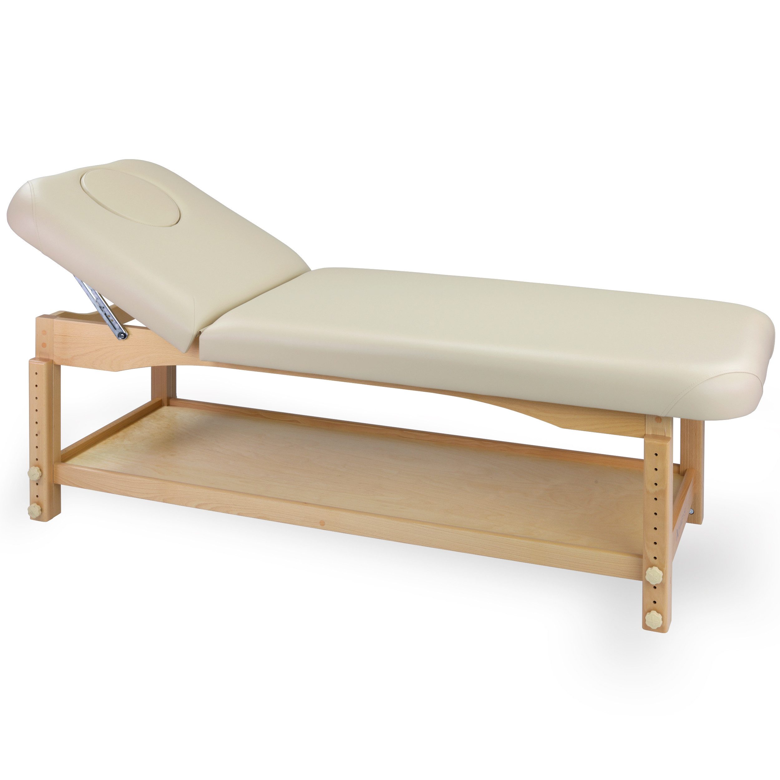 Der hochwertige Schaumstoffbezug der stationären Massageliege bietet dem Patienten während der Behandlung höchsten Komfort und beste Entspannung. Das natürliche Buchenholz und die massive Liegefläche mit abgerundeten Ecken verleihen der stationären Behandlungsliege ein modernes Aussehen.