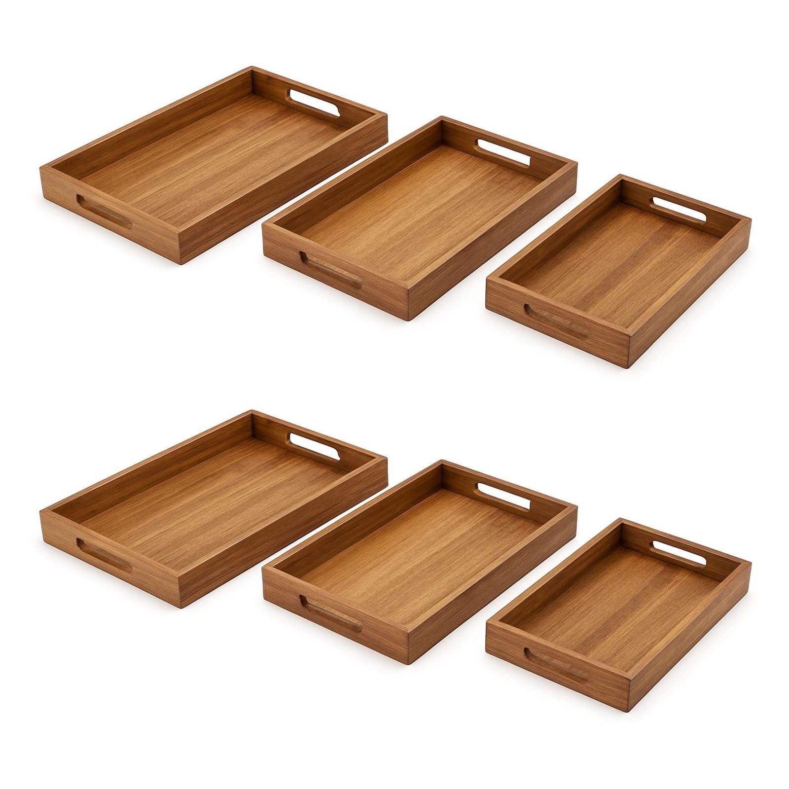 Entdecken Sie dieses stilvolles 6er Set eckige Servierset aus hochwertigem Akazienholz. Drei verschiedene Größen ermöglichen flexible Einsatzmöglichkeiten – ineinander stapelbar und mit praktischen Tragegriffen versehen. Robustes Akazienholz mit eleganter Maserung sorgt für einen stabilen Halt und einen stilvollen Auftritt. Das schlichte, zeitlose Design passt auf jeden gedeckten Tisch und macht die Tabletts zu einem echten Hingucker. Die Griffmulden sind besonders griffig konstruiert, sodass Sie auch voll beladen alles sicher transportieren und anschließend wieder abstellen können. Das Dreier-Set lässt sich beliebig kombinieren oder einzeln verwenden, sodass Sie jederzeit flexibel bleiben. Die drei Größen – Groß 40 x 30 x 4,5 cm, Mittel 35 x 25 x 4,5 cm und Klein 30 x 20 x 4,5 cm – ermöglichen vielfältige Einsatzmöglichkeiten: Frühstückstablett fürs Bett, Getränketablett, Teetablett, Snacktablett für gemütliche Picknicks oder schlicht als dekoratives Deko-Tablett. Die Servierplatten sind ineinander stapelbar und spart so Platz, wenn es nicht in Gebrauch ist. Zur Reinigung genügt ein feuchtes Abwischen, anschließend das Tablett aufrechtstehend trocknen lassen.