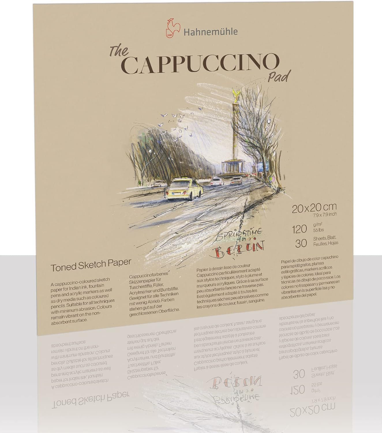Hahnemühle The Cappuccino Pad, 120g/m², 30 Blatt/60 Seiten, Skizzenpapier, getöntes Zeichenpapier (20 x 20 cm) Die Tönung des cappuccinofarbenen Papiers erinnert an frisch aufgeschäumten Milchkaffee und bietet deinen warmen Motiven einen hervorragenden Untergrund. Die sanfte Tönung des 120 g/m² schweren Papiers unterstreicht super die Leuchtkraft deiner farbigen Stifte. Zudem stehen Farben gut auf den getönten Papieren. Das glatte Skizzenpapier mit geschlossener Oberfläche ist perfekt für Tintenstifte, Füllfederhalter, Buntstifte, Acrylmarker oder andere wasserbasierte Stifte. Die 30 Blätter im kopfgeleimten Block bilden auch gerahmt einen schönen Blickfang an deiner Wand.