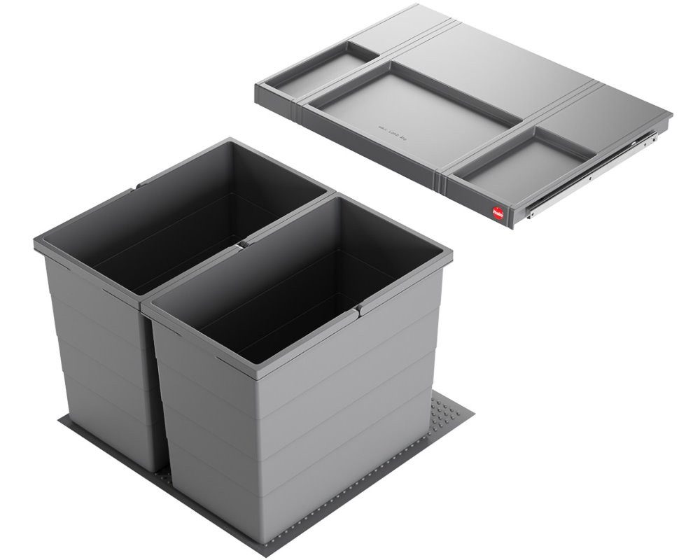 Das Hailo Всеgro System bietet Flexibilität für die speziell auf Ihre Bedürfnisse zugeschnittene Abfalltrennung in der Küche. Das System passt, ohne aufwenige Montage, in jede bauseits vorhandene 60cm breite Schublade. Das mobile Einbausystem ermöglicht neben dem individuellen Zuschnitt der Matte den Einsatz von verschiedenen Inneneimern. Der Planung sind hierbei keine Grenzen gesetzt. Diese Vielseitigkeit ermöglicht es, den verfügbaren Platz in Ihrem Küchenschrank optimal zu nutzen und gleichzeitig die Mülltrennung effizient zu gestalten. Im aktuellen Angebot wird nachfolgend ein Mülltrennsystem mit 2x 28 Liter Inneneimern in einer Höhe von 350 mm angeboten. Über den etnehmbaren Eimern kann Ein Systemdeckel im Schrank montiert werden, welcher mit einer Traglast von 5 kg zusätzlich benötigte Küchenutensilien aufnimmt. Durch das sepaerate Herausziehnen der Abdeckung sind diese immer griffbereit.
