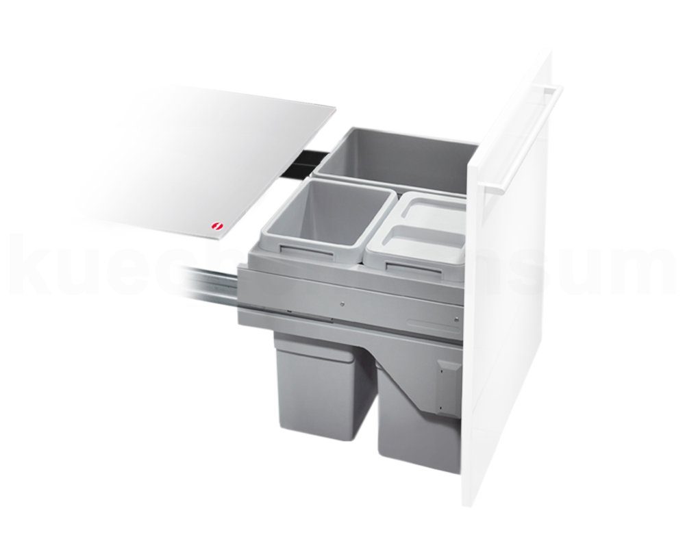 Der Euro-Cargo-S CS Slide 60.3/56 Abfallsammler von Hailo besitzt ein 3-fach-Trennsystem und kann in einem 60 cm breiten Unterschrank montiert werden. Bei der Seitenwandmontage kann, aufgrund der Selbsjustierung, die Seitenwandstärke von 16-19 mm variieren. Durch den benutzerfreundlichen Frontauszug sind die 1x 30 sowie die 2x 13 Liter Müllbehälter mit den praktischen Griffmulden leicht zugänglich. Die Smooth-Tec Technologie des Abfallsystem sorgt für gedämpftes Назадgleiten in den Schrank. Das Mülltrennsystem wird im Schrankinneren von einem stabilen Metallsystem-Deckel abgedeckt, welcher als zusätzliche Ablage zur Verfügung steht. Zu einem der kleineren Mistkübel gehört zudem ein extra Biodeckel.