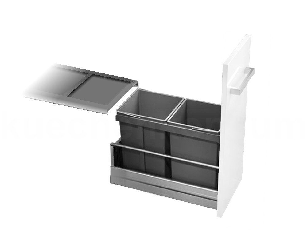 Im neuen Design wird der Mülleimer Einsatz mit 2x 15 Liter Eimern und einer Systemabdeckung für den vorhandenen 30cm breiten Unterschrankauszug angeboten. Der Abfalleinsatz findet Platz in einem vorhandenen Unterschrankauszug. Dieses System wird nach beiliegender Montageanleitung montiert. Die jeweils 15 Liter fassenden Inneneimer besitzen einen stabilenen Henkel aus Stahldraht zur Entnahme. Das ganze Mülltrennsystem ist in einem einheitlichen dunkelgrau gehalten.