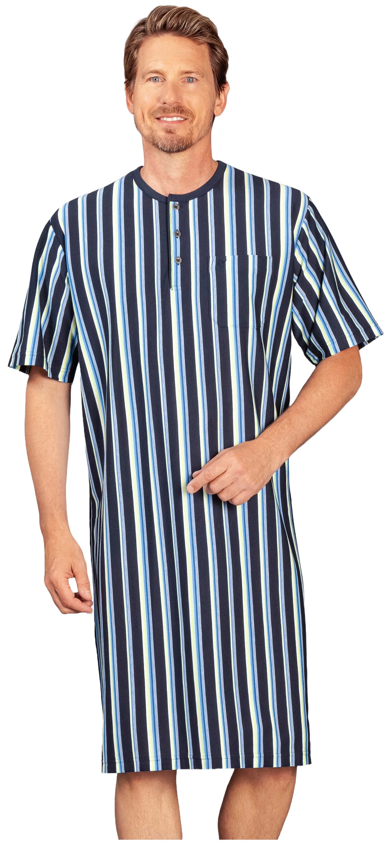 Das Hajo Herren Nachthemd mit kurzem Arm präsentiert sich in einem zeitlosen und komfortablen Design. Der Rundhals-Ausschnitt verleiht dem Nachthemd einen klassischen Look, während die praktische Knopfleiste nicht nur einen Hauch von Eleganz hinzufügt, sondern auch das An- und Ausziehen erleichtert. Das Material des Nachthemds besteht aus einer angenehmen Mischung von 62% Baumwolle und 38% Polyester. Diese Kombination sorgt für ein weiches und bequemes Tragegefühl, während die Polyesteranteile die Pflegeleichtigkeit und Strapazierfähigkeit des Nachthemds erhöhen. Die Длина des Nachthemds beträgt 110 cm, was eine großzügige Passform gewährleistet. Die kurzen Ärmel machen das Nachthemd besonders geeignet für wärmere Nächte oder für diejenigen, die sich gerne leichter bekleiden, wenn sie schlafen. Insgesamt bietet dieses Herren Nachthemd mit kurzem Arm, Rundhals-Ausschnitt und Knopfleiste eine gelungene Kombination aus Stil, Komfort und Funktionalität für einen angenehmen und erholsamen Schlaf.
