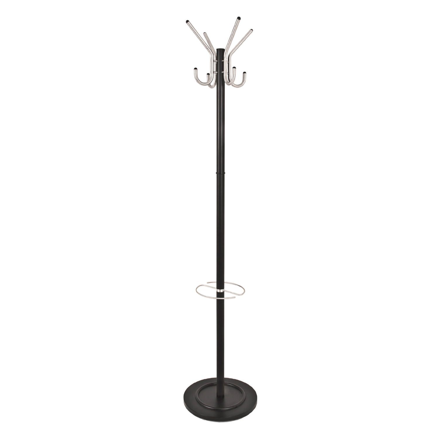 Garderobenständer aus schwarz lackiertem Stahlrohr, Garderobenhaken und Schirmhalterung alufarben lackiert
