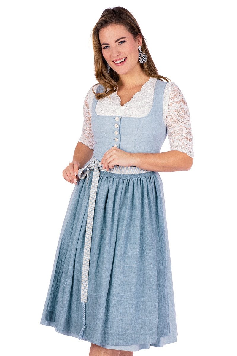 Dieses schmucke, wadenlange Midi Dirndl namens Pillersee in Eisblau wird mit viel feiner Baumwolle, Leinen und Stretch-Anteil in angenehmer Stoffqualität gefertigt und hat allover ein zartes Linien-Webmuster in dezenter Cord-Optik in Eisblau/Hellbeige. Der schöne, abgerundete Balconette-Ausschnitt sowie die Armausschnitte sind edel mit Dirndlstoff abgepaspelt. Die Knopfleiste des attraktiven Midi Dirndls in Wadenlänge zieren kernige Knöpfe in Stein-Optik in Hellbeige. Das talliert geschnittene Miederoberteil ist sauber abgefüttert. Der Rock verfügt beiseitig über Eingrifftaschen und den Rockabschluss schmücken zwei feine Samtborten in dezentem Petrol. Die feine, leichte Dirndlschürze mit Viskose-Anteil ist am Bund gehanselt, hat ein rustikal angehauchtes Webmuster sowie einen dezenten Knitter-Look und wird von einem hübschen Schürzenbindeband im Folklore-Look gehalten. Das Bindeband mit dem tollen Webmuster im Zickzack-Style in Hellblau/Hellbeige endet jeweils geflochten und mit einer kleinen Troddel in Hellblau. Bitte beachten Sie die Größenzuschläge ab Размер 48. Im Lieferumfang sind das Dirndl und die Dirndlschürze enthalten, eine Dirndlbluse ist nicht inbegriffen.