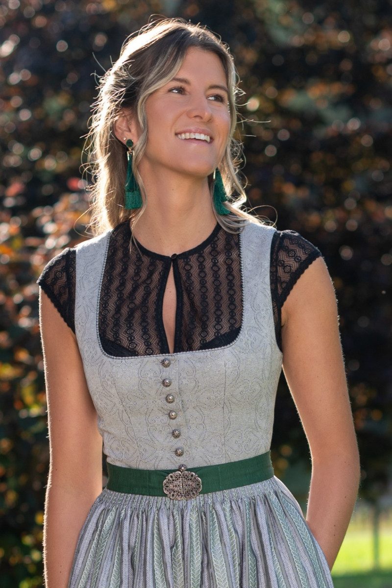 Ein besonderes Highlight ist das kniebedeckende Midi Dirndl "Pillersee" in Hellgrau/Tanne. Es hat ein Mieder im Jacquard-Look mit Balconette-Ausschnitt und Knopfleiste, einen zart bedruckten Baumwoll-Rock und eine bezaubernde Schürze im Streifen-Design mit Schließe. Das taillierte, sauber abgefütterte Mieder ziert ein raffiniertes, fein quer geriffeltes Webmuster mit eingewebten Ornamentik-Herzen in Form von vierblättigen Blüten als feine Konturen in Dunkelgrau mit zarten Ornamenten in Eisgrau dazwischen. Der schöne Ausschnitt ist mit einer fein schimmernden Borte im Kordel-Look abgepaspelt, die Armausschnitte mit Miederstoff. Adrette, altsilberne Ösenknöpfe mit floralen Ornamenik-Motiv schmücken die Knopfleiste. Der schöne, in breite Kellerfalten gelegte Rock mit dem zarten Printmuster aus angedeuteten Kreisen und Pünktchen in Weiß auf Hellgrau verfügt beidseitig über Eingrifftaschen. Das elastische, tannengrüne Schürzenband mit einem feinen Webmuster aus zarten Längslinien wird mit der hübschen Metallschließe im floralen Ornamentik-Ajour-Design in Altsilber zum Einhaken vorn fixiert und hält die wundervolle, am Bund gehanselte Schürze im Streifen-Design, geformt aus Streifen in Grau, stilisierten Ranken in Eisgrau und tannengrünen Blätterranken, mit dem geraden Saum. Im Lieferumfang ist das Dirndl mit der Schürze enthalten, eine Dirndlbluse und Accessoires sind nicht inbegriffen. Bitte beachten Sie ab Размер 48 die Größenzuschläge.