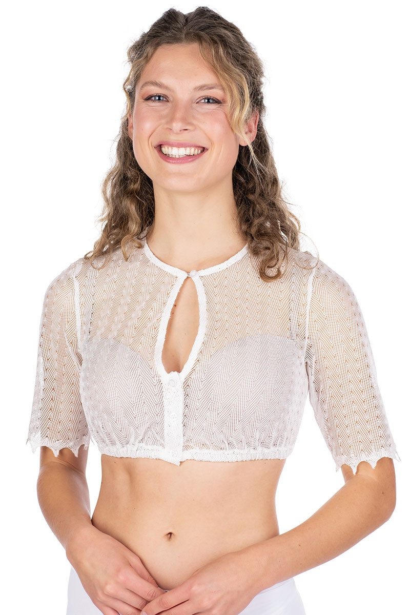 Zarte Dirndlbluse aus semitransparenter Spitze mit raffiniertem Streifen-Ornamentik-Design