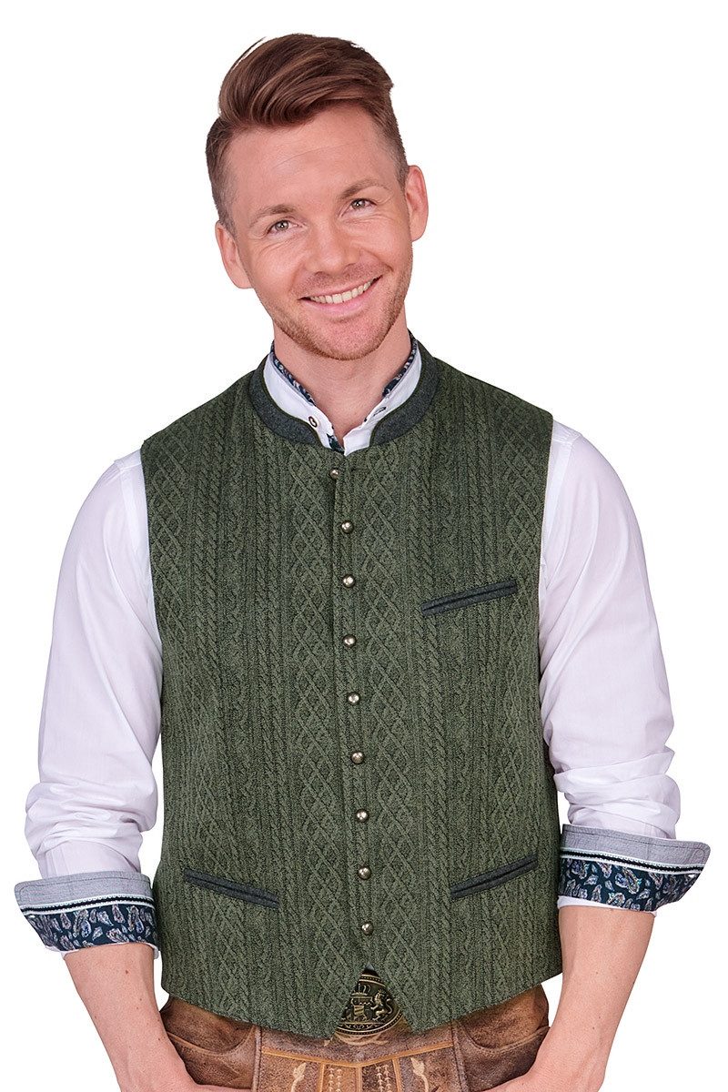 Die schmucke Herren Trachtenweste Anton in Oliv aus dem Hause Hammerschmid wird mit angenehmer Baumwolle gefertigt, hat einen schönen Stehkragen und Paspeltaschen. Vorn und an den Seiten ziert ein fantastisches, raffiniert gearbeitetes Printmuster in dreierlei Zopf-Designs das Gilet. Der traditionelle Kragen aus Walkmaterial in Grau hat innen Walkstoff in Oliv als Verstärkung, das außen als Paspelkante sichtbar ist. Sowohl die Brusttasche links als auch die Eingrifftaschen vorn sind mit doppelten Paspeln aus Walkmaterial in Grau gearbeitet. Tolle, kleine Ösenknöpfe in Altsilber mit feinem Wappen-Motiv zieren die Knopfleiste der zünftigen Herrenweste. Der klassische, schwarze Westenrücken besteht aus Baumwolle mit Stretch-Anteil und verfügt über einen verstellbaren Rückenriegel mit einer anthrazit-farbenen Schnalle für den perfekten Sitz. Die kernige Weste ist sauber mit einem glanzvollen Stoff im Linien-Look abgefüttert und hat links eine Innentasche. Bitte beachten Sie die Größenzuschläge ab Размер 58.