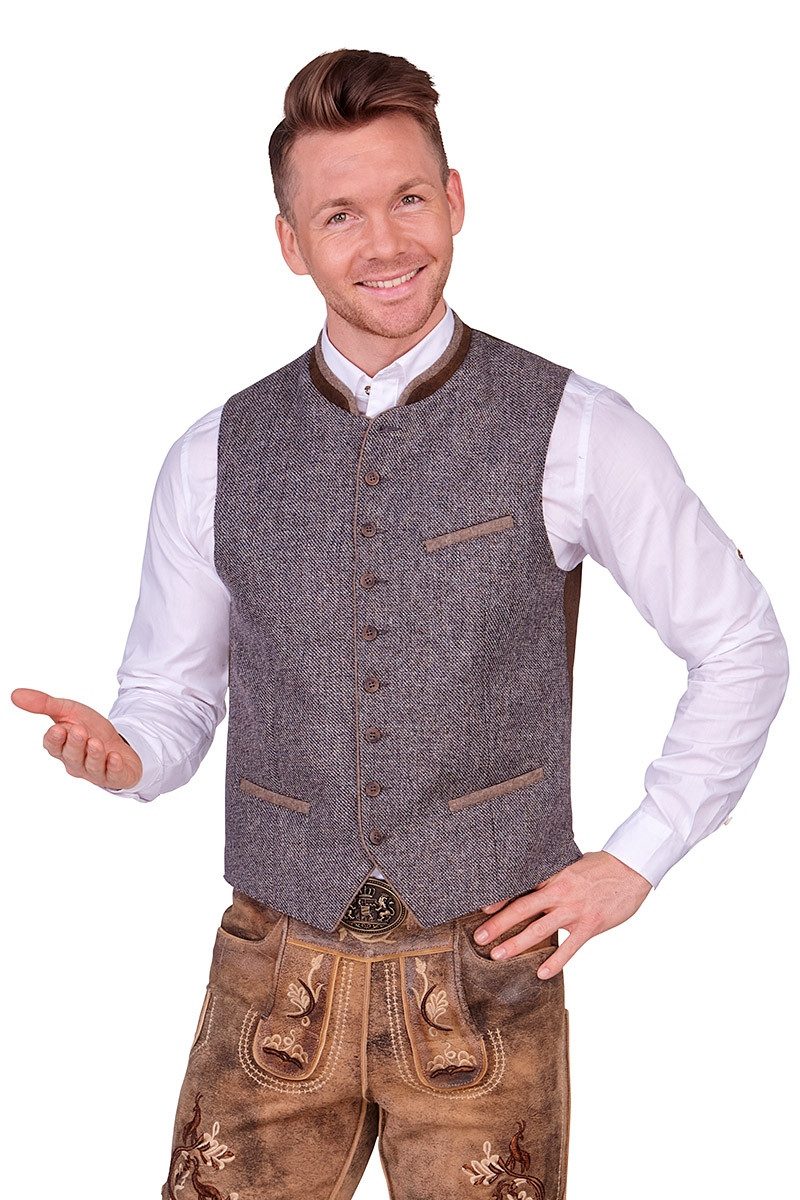 Bernd, die krachige Herren Trachtenweste aus dem Hause Hammerschmid in Taupe, hat eine Vorderseite aus Schurwolle mit einem rustikalen Webmuster in Twill-Art aus Garnen in Braun, Blau sowie Beige und einen edlen Westenrücken aus changierendem Jacquard mit einem zarten, floralen Ornamentik-Webmuster, der je nach Lichteinfall trachtengrün oder braun schimmert. Der Stehkragen aus Loden in Haselnuss Melange ist kernig mit einem Veloursleder-Besatz in Braun geschmückt. Links gibt es eine Brusttasche und vorn zwei Eingrifftaschen - allesamt als einfache Paspeltaschen aus Loden in Haselnuss Melange gearbeitet. Die Knopf- sowie Knopflochleiste sind ebenfalls mit Loden in Haselnuss abgepaspelt. Perfekt wird das urige Gilet durch die tollen Knöpfe in Holz-Optik. Für einen guten Sitz sorgt der verstellbare Rückenriegel mit Schnalle und für einen angenehmen Tragekomfort das Futter im feinen Streifen-Look. Links gibt es zudem eine Innentasche. Bitte beachten Sie die Größenzuschläge ab Размер 58.