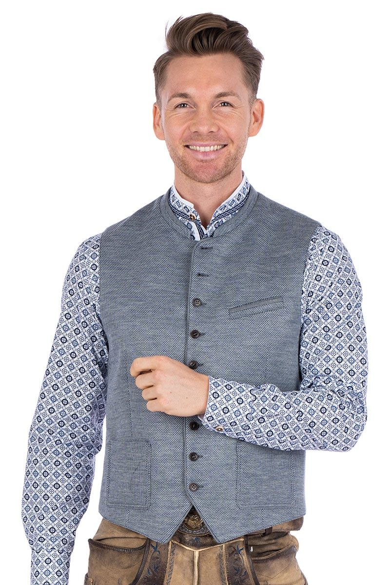 Eine elegante Trachtenweste mit einem leicht taillierten Slim Fit-Schnitt, der für eine figurbetonte Passform sorgt. Gefertigt aus weicher Schurwolle bietet sie eine angenehme Haptik. Das raffinierte Webmuster ist in klitzekleiner, rechteckiger Karo-Art. Der verstärkte Stehkragen ist mit einem Kontraststoff-Besatz versehen. Die Knopf- und Knopflochleiste ist ebenfalls verstärkt und mit einer dezenten Kontrast-Paspel versehen. Die marmorierten Knöpfe fügen sich harmonisch in das Gesamtbild ein. Die Brusttasche auf der linken Seite, ist mit einer einfachen Paspel und einer Kontrastkante versehen ist, sowie die beidseitig vorn aufgesetzten Taschen. Der Rücken der Weste ist mit einem verstellbaren Riegel aus Westenstoff und einer Schnalle ausgestattet, sodass die Passform individuell angepasst werden kann.Ab Размер 58 bitte Größenzuschläge beachten.