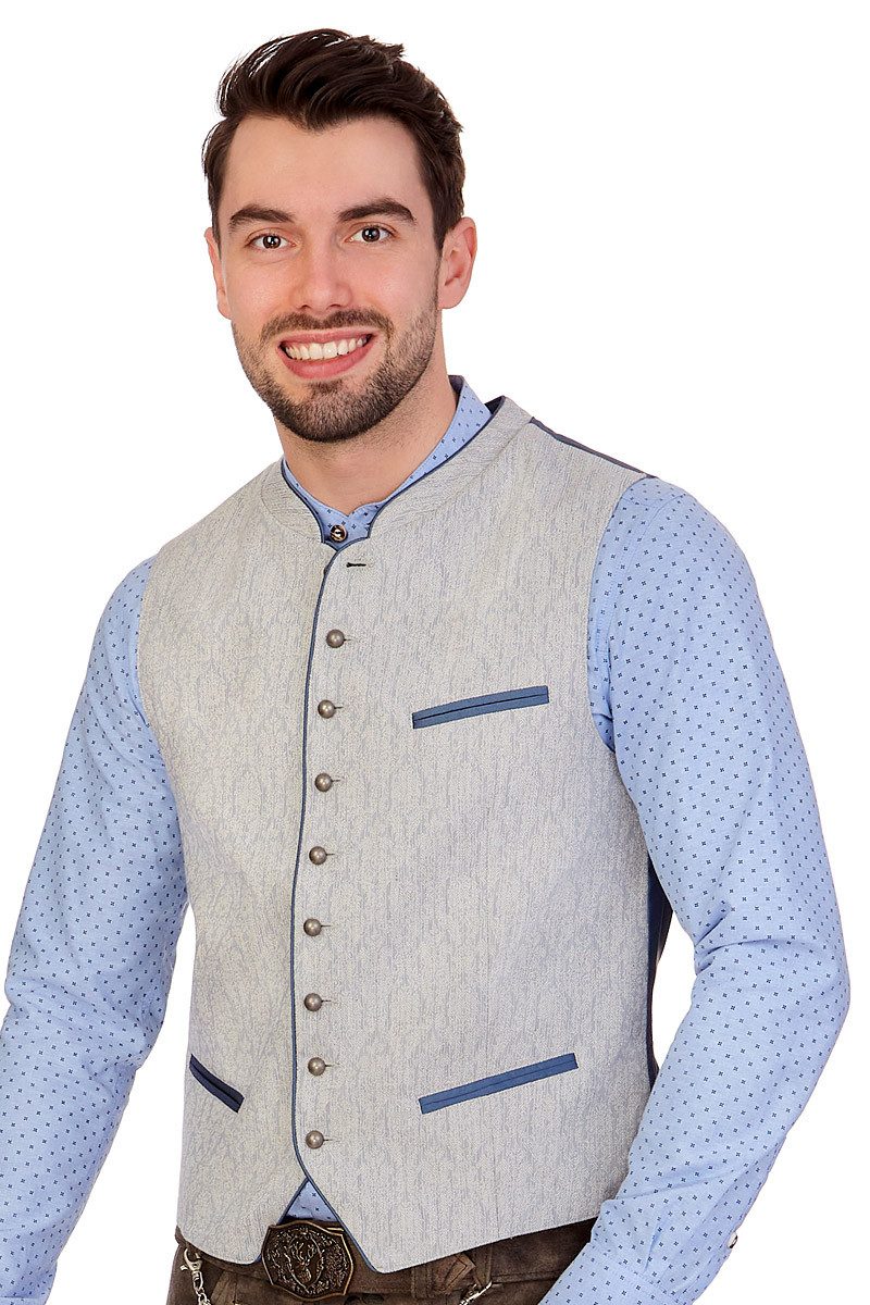 Die elegant-klassische Trachtenweste Marius, ein eindrucksvolles Meisterstück aus dem Hause Hammerschmid, hat vorn einen Baumwoll- sowie Leinen-Anteil und ein geschmackvolles, feines Webmuster. Der schöne Stehkragen ist innen mit Kontraststoff verstärkt, der außen als Paspelkante sichtbar ist. Die Knopfleiste des Gilets zieren kleine, mattglänzende Kugelknöpfe. Es gibt eine Brusttasche links und zwei Eingrifftaschen vorn, allesamt mit doppelten Paspeln aus Kontraststoff betont. Der edle Westenrücken aus glänzendem, unifarbenem Taft macht die exquisite Kreation perfekt. Für einen optimalen Sitz sorgt der Rückenriegel mit Schnalle. Das glänzende Innenfutter ergibt einen angenehmen Tragekomfort und es gibt eine Innentasche links. Die Herrenweste lässt sich prima kombinieren und passt für einen Partnerlook zum Dirndl Koflersee AW-12990. Beachten Sie bitte die Übergrößenzuschläge ab Размер 58.