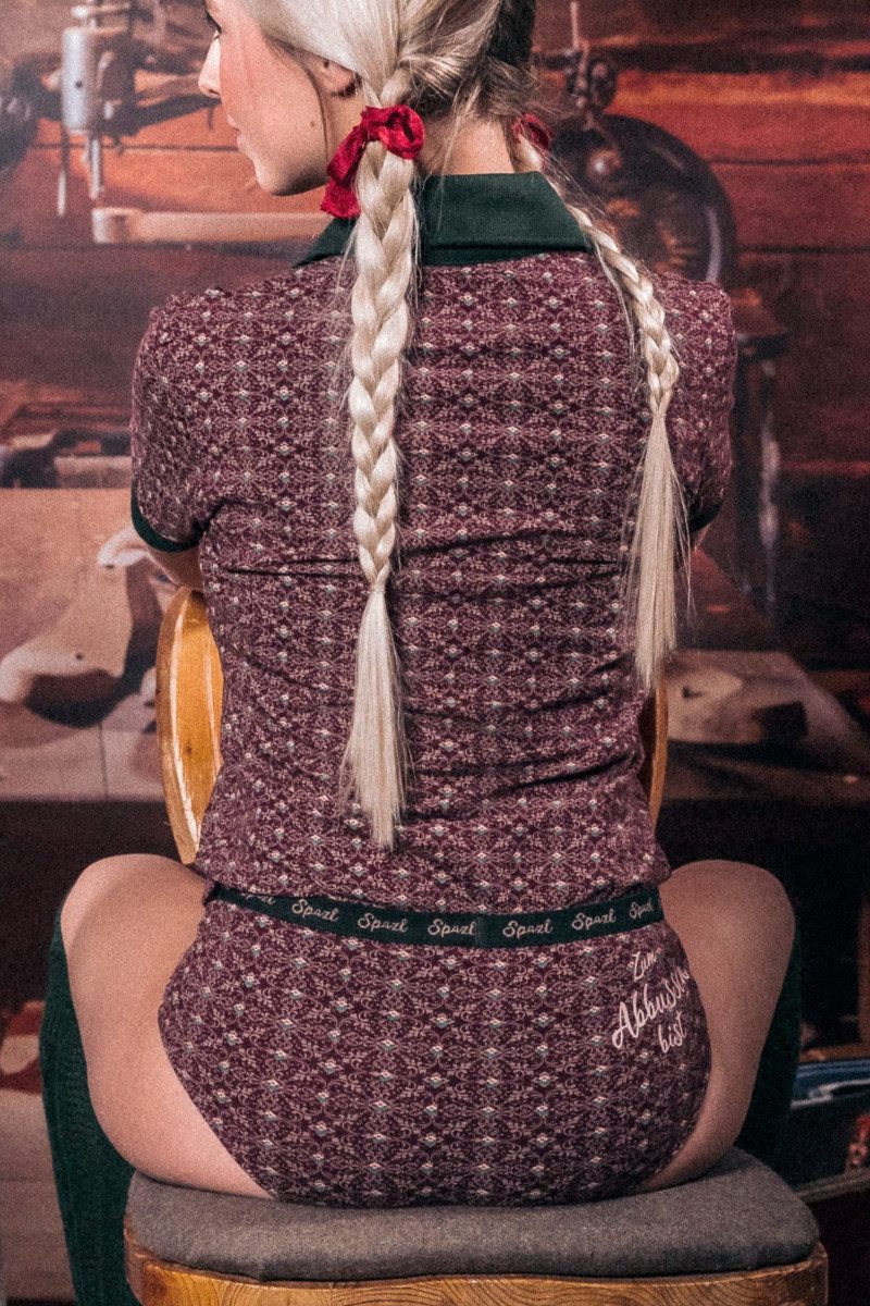 Der kecke Damen Slip Josefina im hüftigen Hipster-Stil, eine verlockende Kreation im jungen Trachten-Look für Drunter von der Marke Hangowear, besteht aus angenehmer Baumwolle mit Stretch-Anteil in Jersey-Qualität, hat einen verstärkten Schrittbereich und einen elastischen Gummibund für einen tollen Tragekomfort. Den tannengrünen Bund schmückt ringsum der eingewebte Schriftzug "Spatzl" in Rosa. Das verträumte allover Ornamentik-Printmuster, akzentuiert durch kleine, dreifarbige Blüten, verleiht dem sexy Damenslip eine fesche Optik. Vorn mittig unter dem Bund ist ein glänzendes Satin-Schleifchen angebracht, an dem ein schöner Herz-Anhänger mit Edelweiß-Blüte in Silber befestigt ist. Die rechte Rückseite der stylischen Damenunterhose ziert der Aufdruck "Zum Abbussln bist" in Rosa.