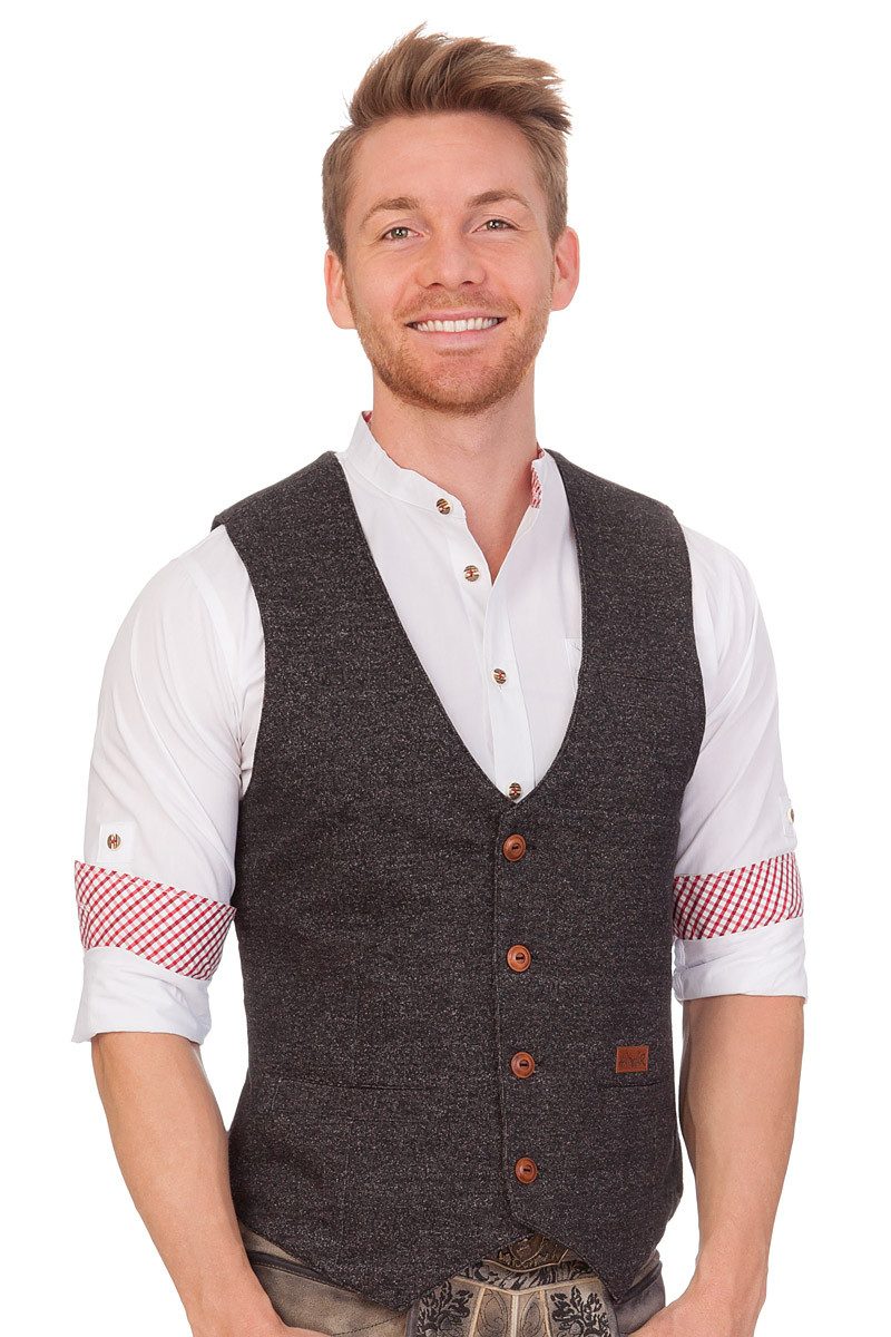 Die Herrenweste Rendy mit ihrem raffinierten, tiefen V-Ausschnitt kommt jung, lässig und trachtig daher. Sie ist in einer Art "Salz und Pfeffer"-Optik gewebt und kann daher zu vielen Trachtenhemden oder Shirts super kombiniert werden. Der tiefe V-Ausschnitt ohne Kragen geht adrett in die Knopfleiste über. An ihr sitzen edle, runde Holzknöpfe mit schöner Maserung. Die außergewöhnliche Weste besitzt eine kleine Brusttasche auf der linken Seite und zwei Eingrifftaschen. Der Saum vorn ist "zackig" gehalten und hinten mittig mit einer kleinen, runden Aussparung gestaltet. Highlight ist auch der Westenrücken mit seinem großem, stylischem Print aus alter Typo mit dem Schriftzug "Wuiderer", der zusätzlich mit handschriftlichem Text über die österreichische Alpen verziert ist. Für einen perfekten Sitz sorgt der Rückenriegel. Die Trachtenweste von der Marke hangOwear ist sauber abgefüttert, besitzt eine schöne, weiche Stoffqualität und trägt sich daher sehr angenehm. Sie fällt etwas enger aus, daher bitte gegebenenfalls eine Размер größer bestellen.
