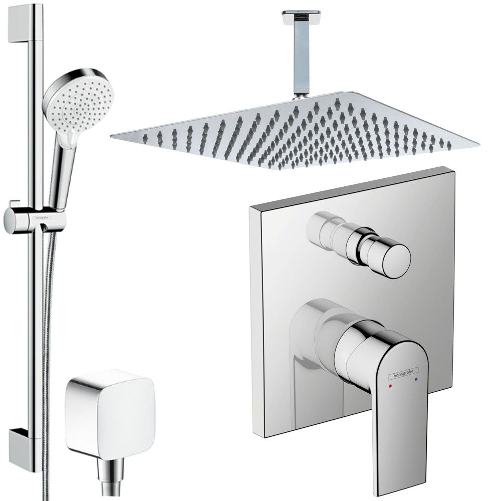 Lieferumfang | [OPTIONAL] Hansgrohe iBox 1 Grundkörper universal, 01800180 Hansgrohe Vernis Shape Einhebel-Wannenmischer Unterputz, 71468000 Hansgrohe Crometta Brauseset Vario mit Brausestange 65 cm, 26532400 Hansgrohe Fixfit Schlauchanschluss, 26457000 Jowi Kopfbrause, 250x250 oder 300x300mm oder 360x360mm Jowi Deckenanschluss, Gesamtlänge: 155mm |
